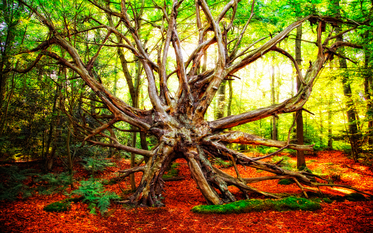 Скачать обои для рабочего стола Старая коряга в осеннем лесу и фото