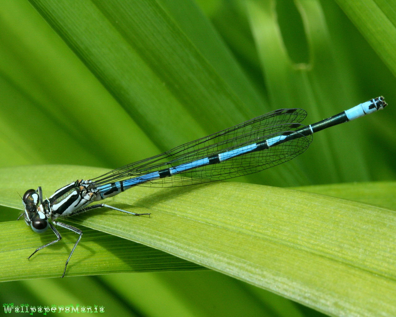 Скачать обои для рабочего стола Стрекоза сидит на зеленом листике и фото