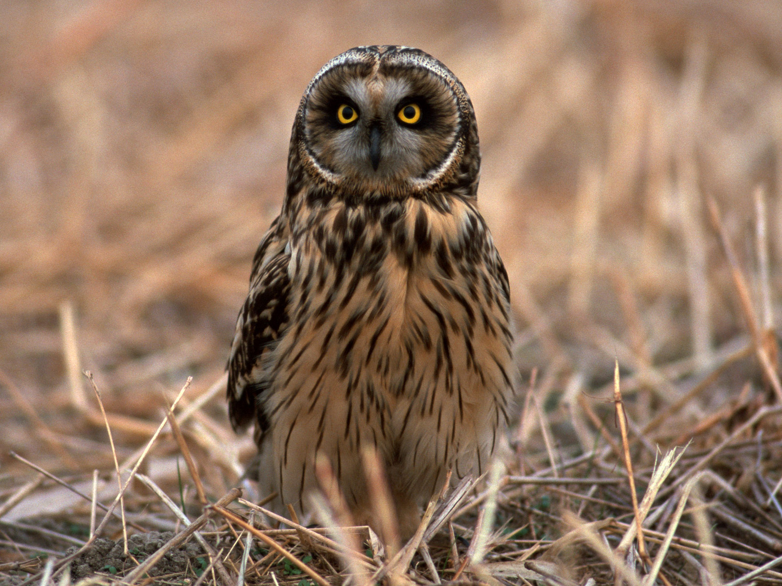 Скачать обои для рабочего стола Суровая сова в зарослях сухой растительности и фото