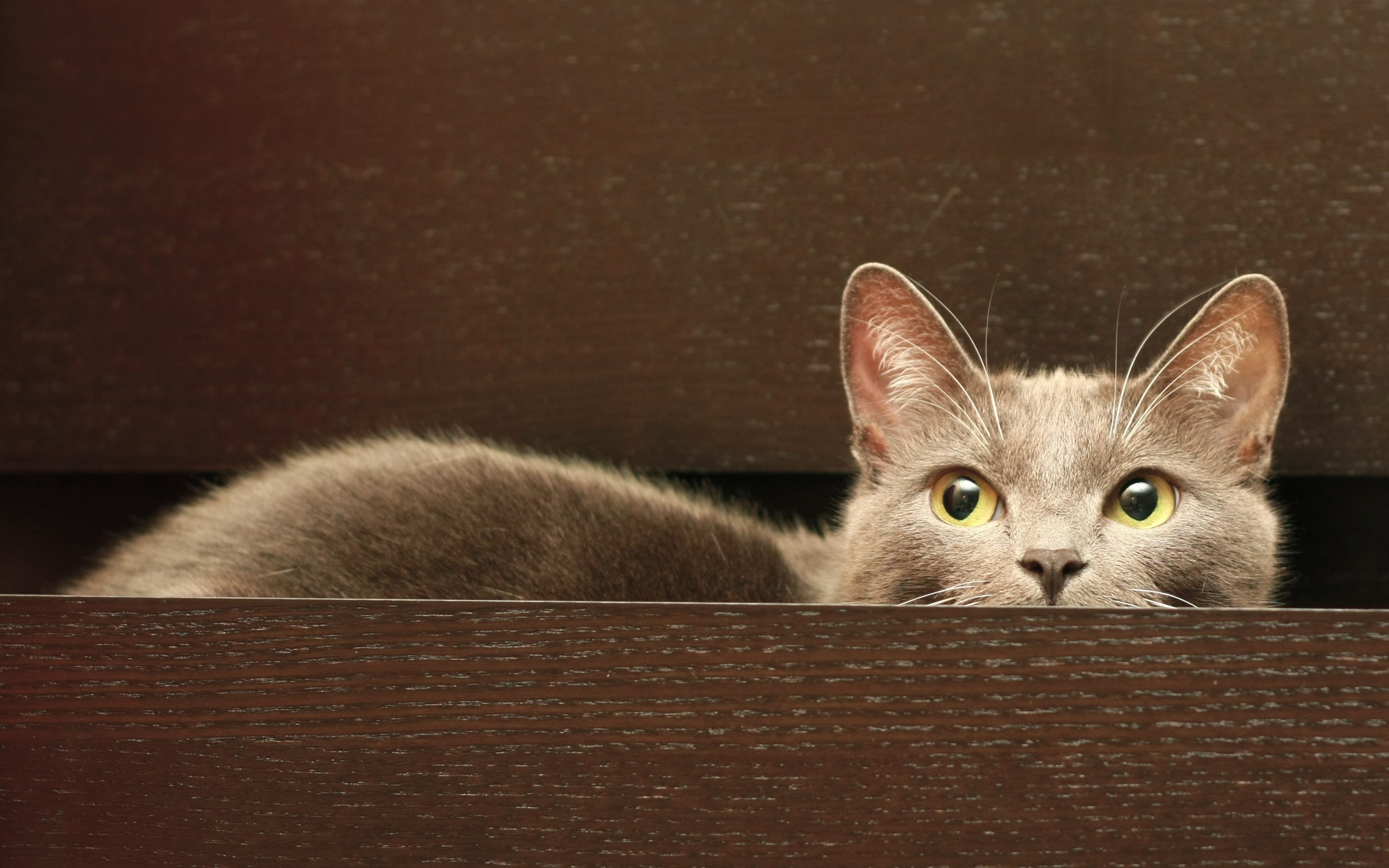 Скачать обои для рабочего стола Тёмно-коричневая кошка в ящике и фото