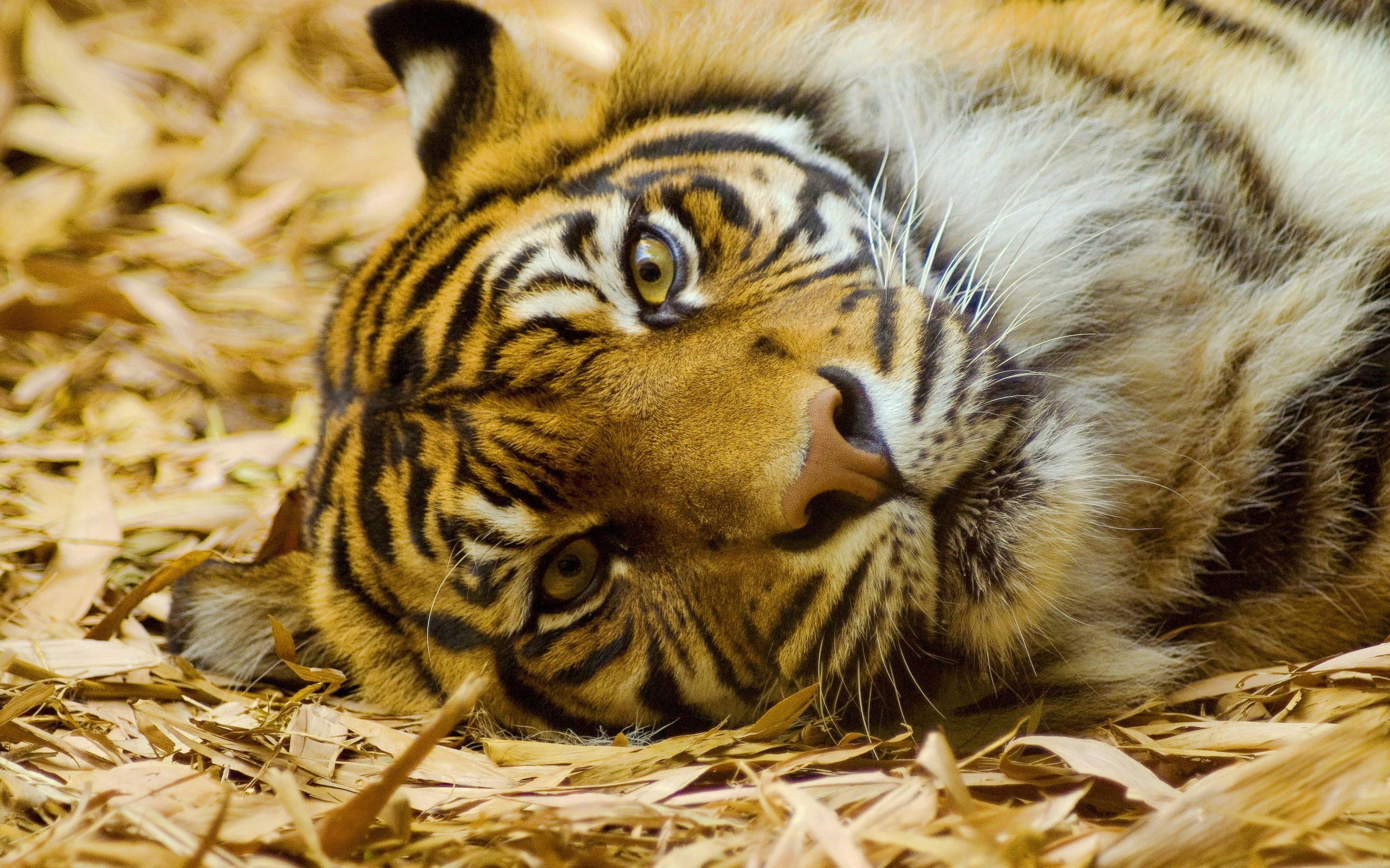 Скачать обои для рабочего стола Тигр прилег на сухую траву и фото