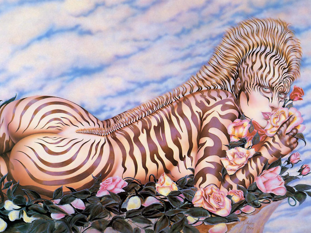 Скачать обои для рабочего стола Тигрица и розы и фото