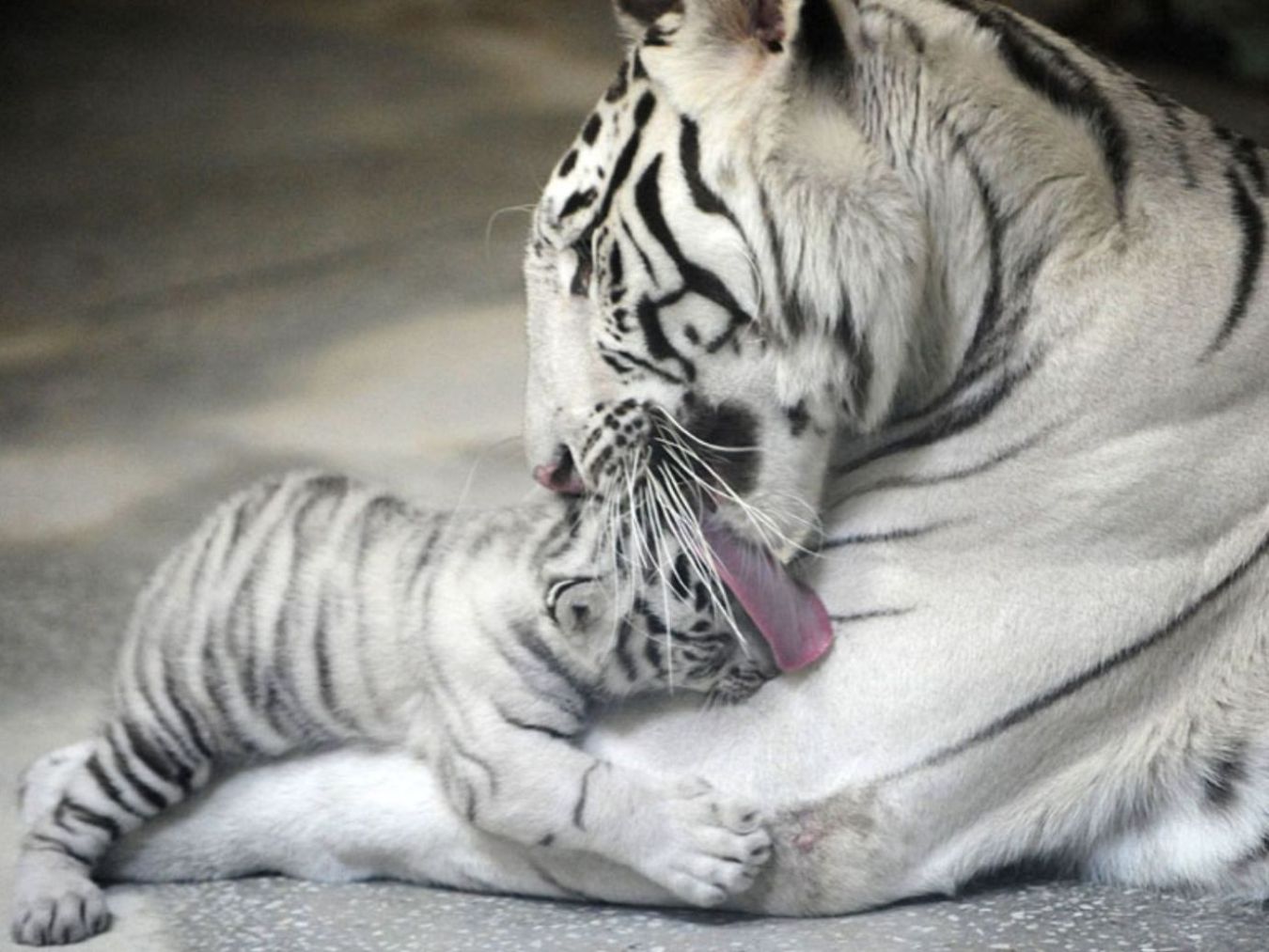Скачать обои для рабочего стола Тигрица с тигрёнком. Альбиносы и фото