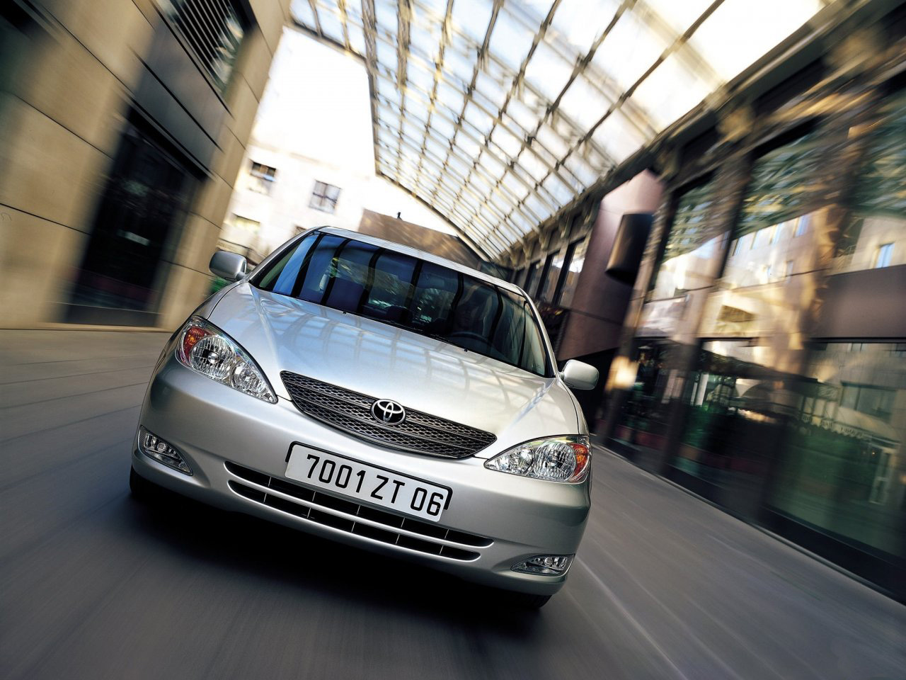 Скачать обои для рабочего стола Toyota Camry в движении вид спереди и фото