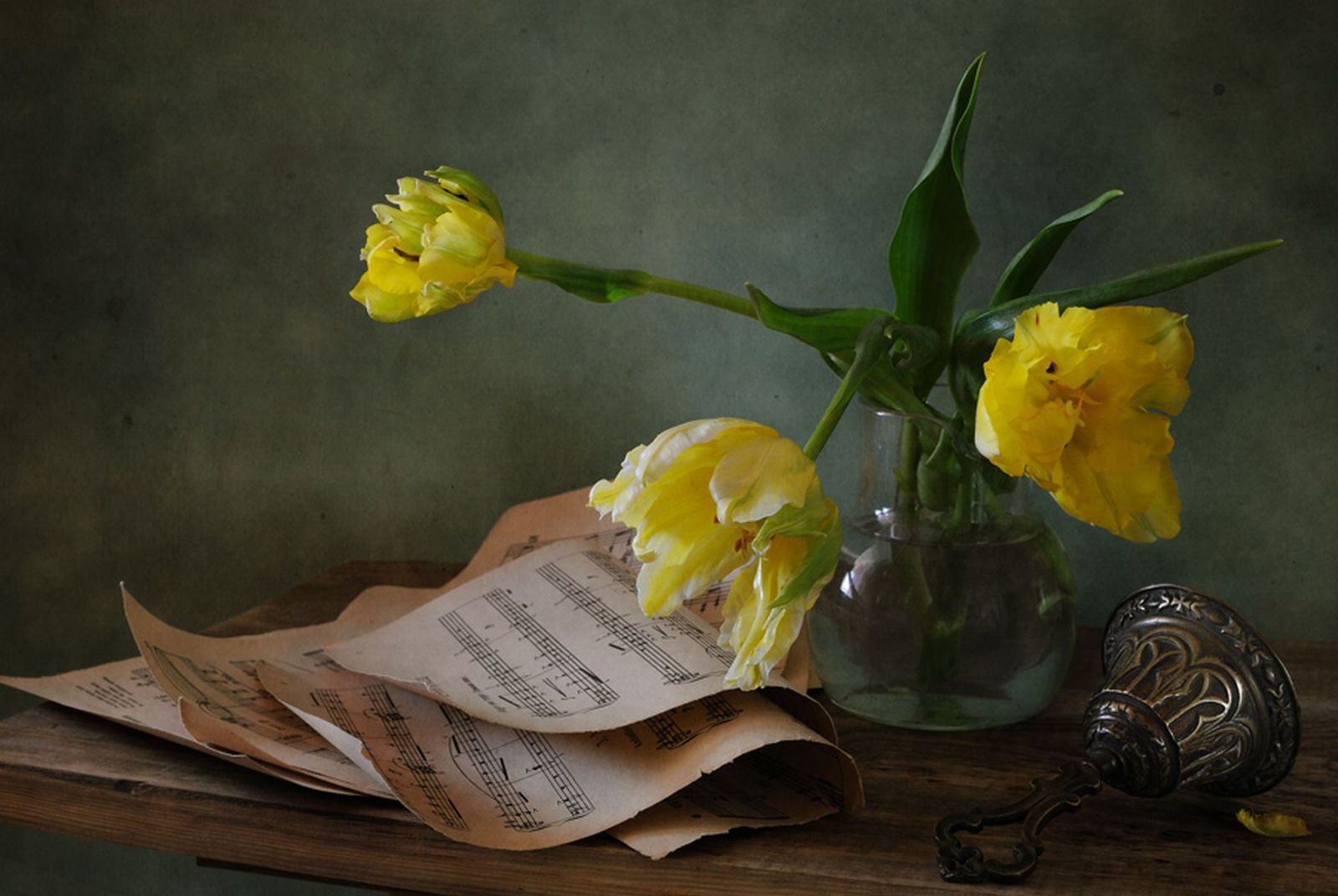 Похожие обои на Три жёлтых тюльпана, ноты и звонок:
