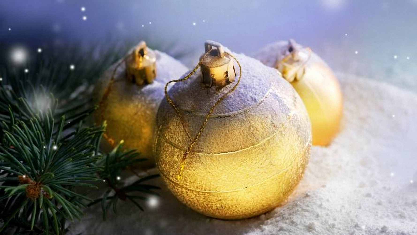 Скачать обои для рабочего стола Три золотых шара в снегу и фото