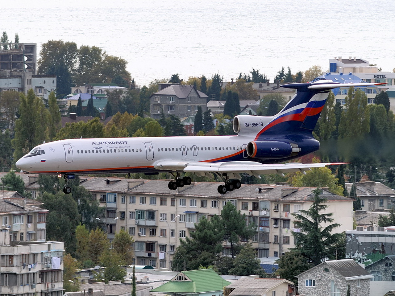 Скачать обои для рабочего стола Ту-154М низко летит над морским городком и фото