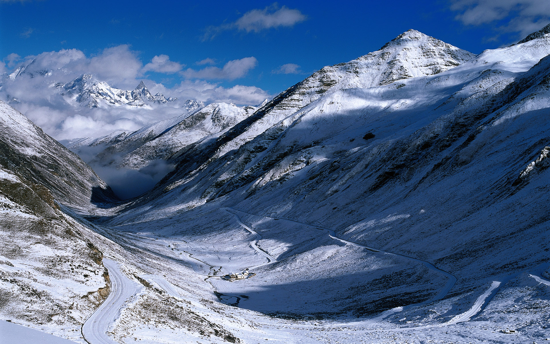 Скачать обои для рабочего стола Туманная долина среди снежных гор и фото