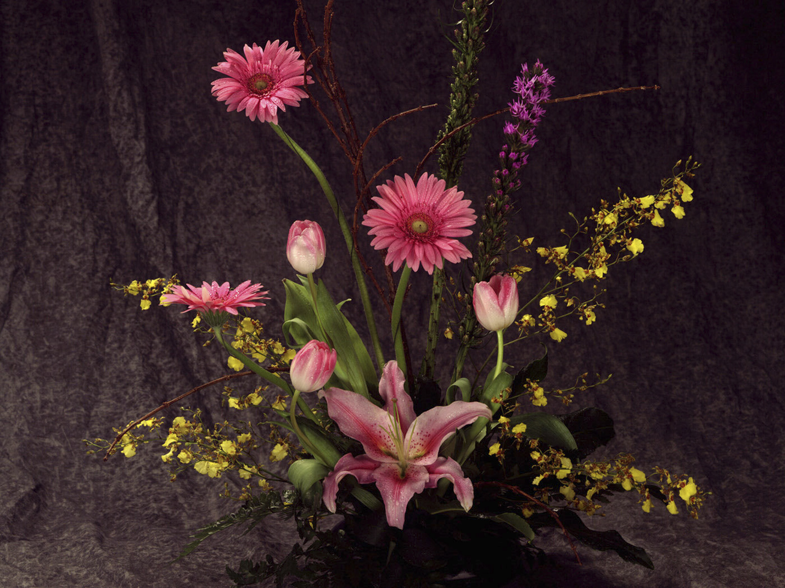 Скачать обои для рабочего стола Тюльпаны, лилия, герберы и фото