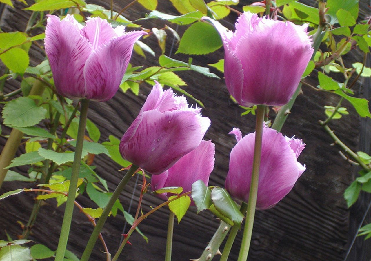 Обои Тюльпаны среди роз