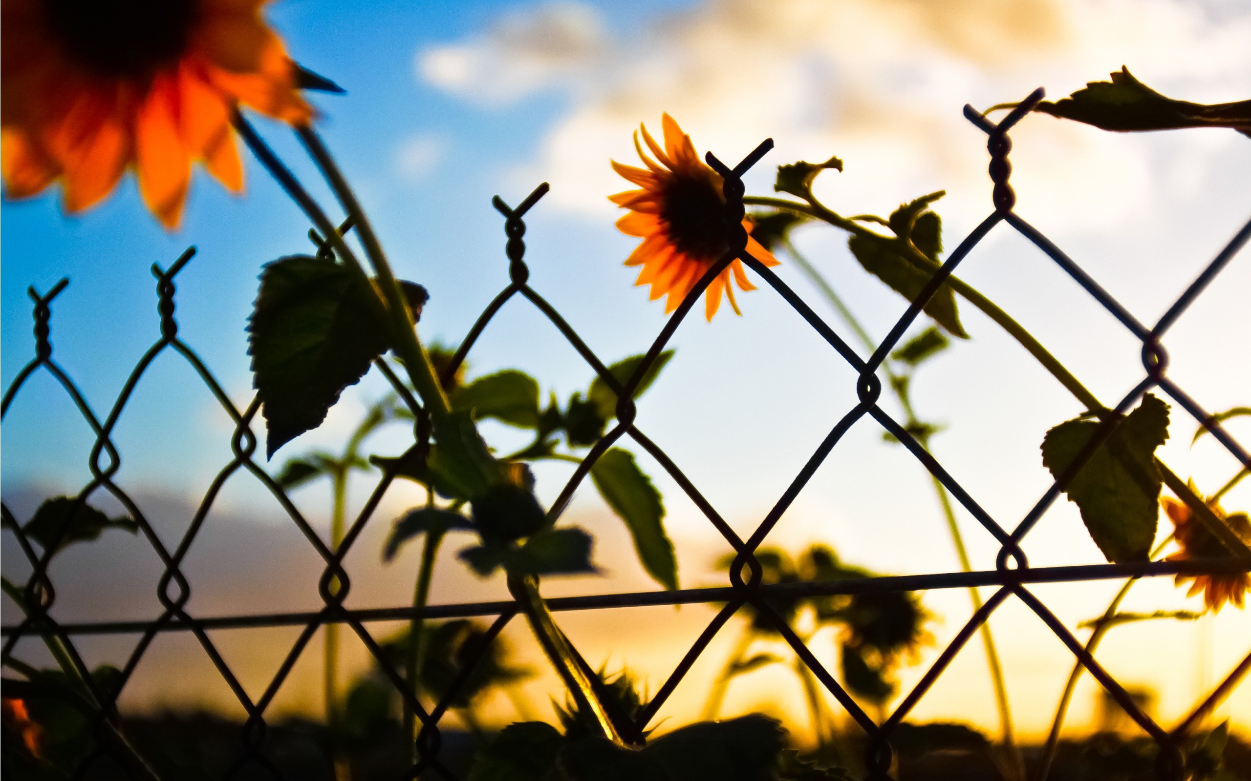 Скачать обои для рабочего стола У сетки подсолнухи под вечер и фото