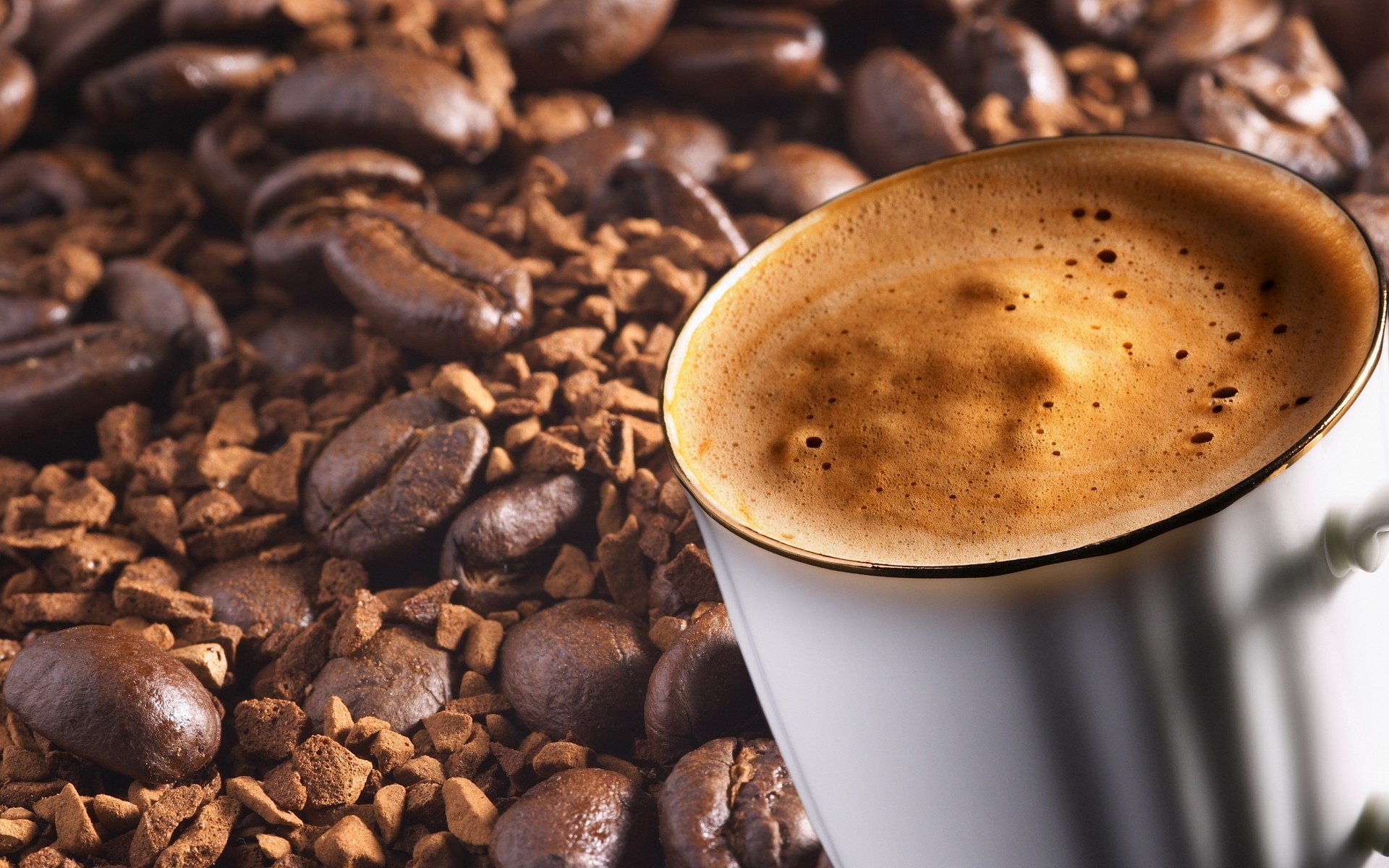 Скачать обои для рабочего стола у зерен чашкa кофe и фото