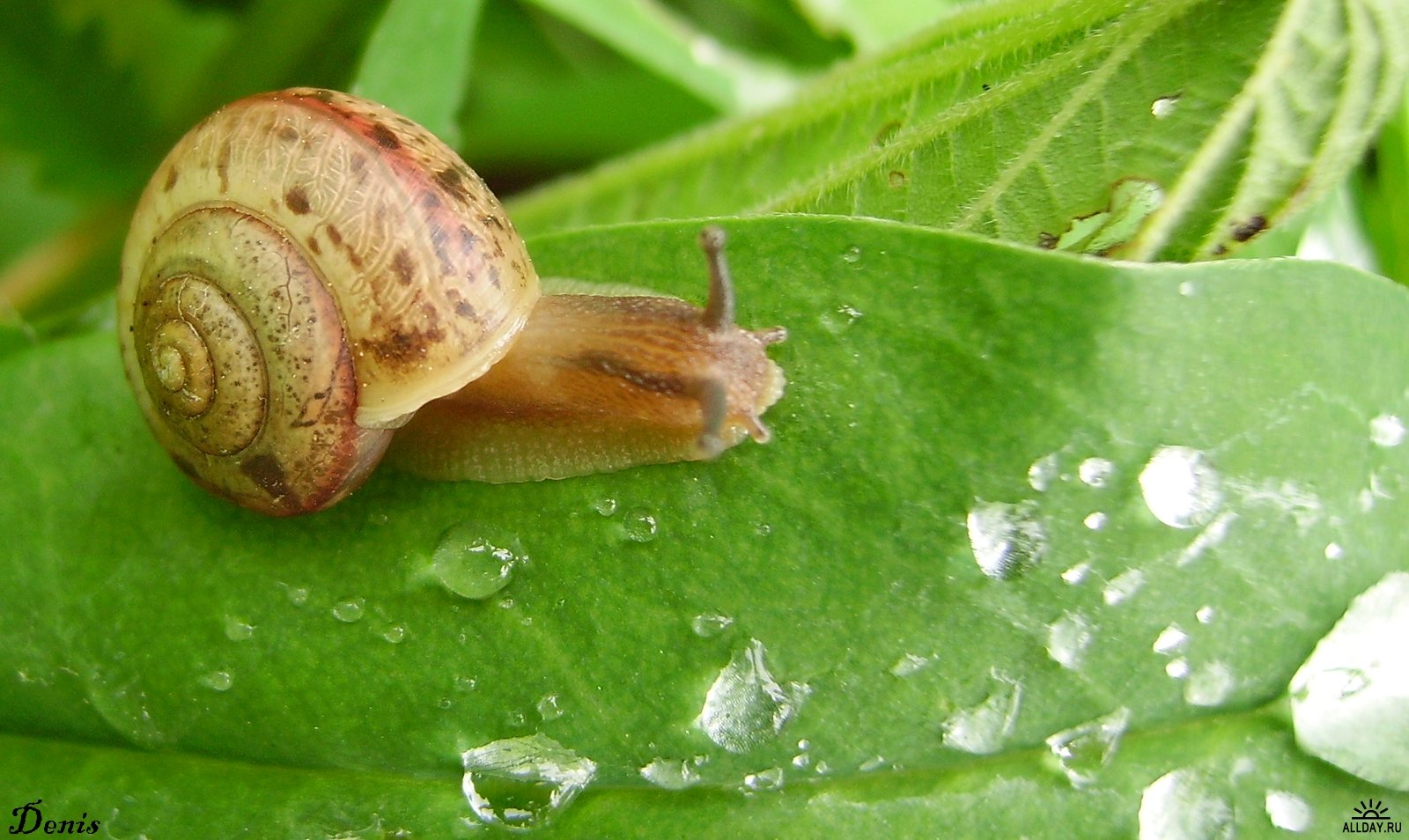 Скачать обои для рабочего стола Улитка ползет по листику и фото