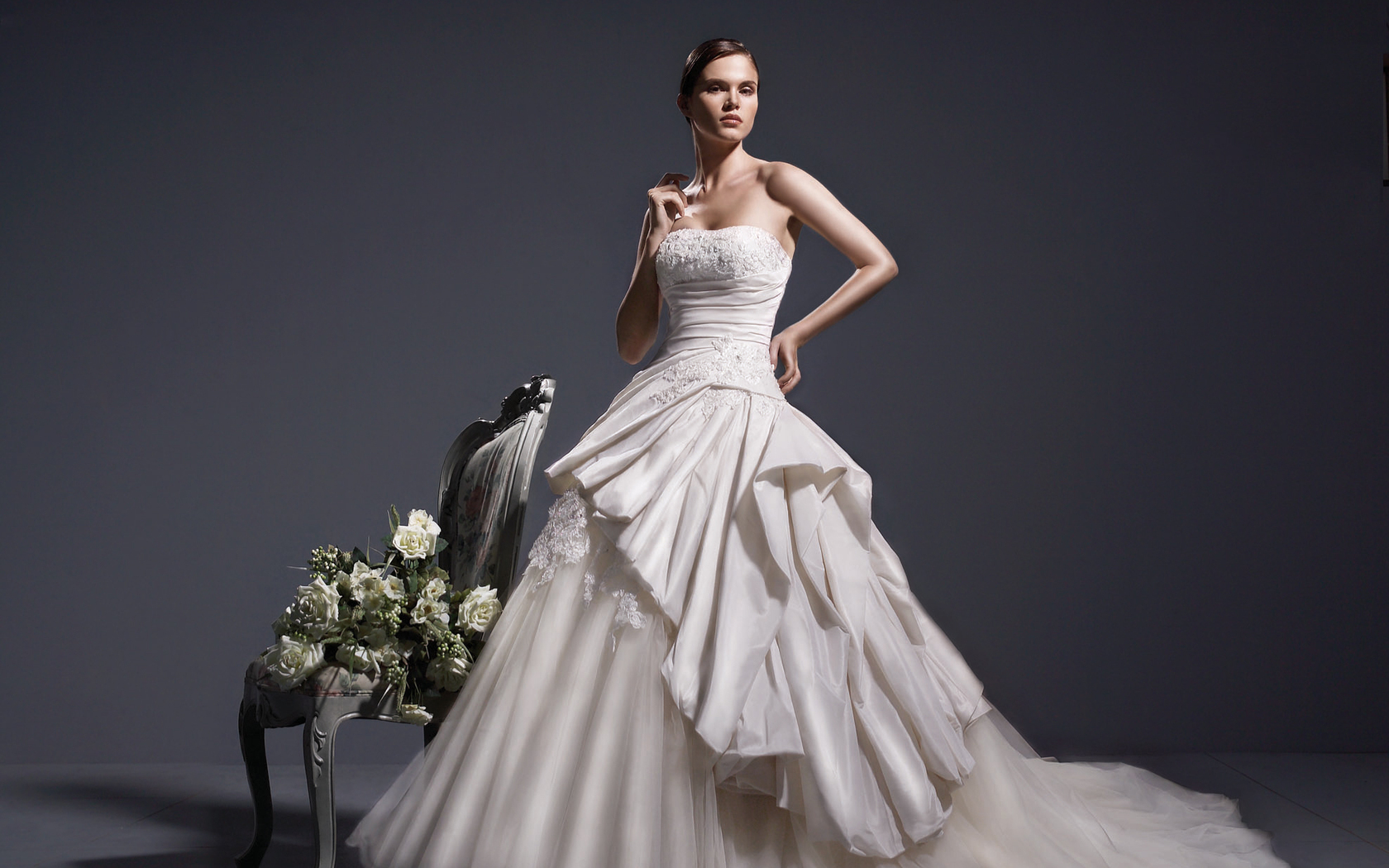 Скачать обои для рабочего стола В белом платье и цветы на стуле белые и фото