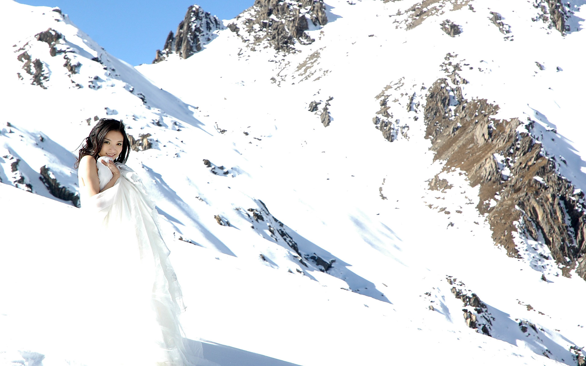 Скачать обои для рабочего стола В белом платье на фоне белых гор и фото