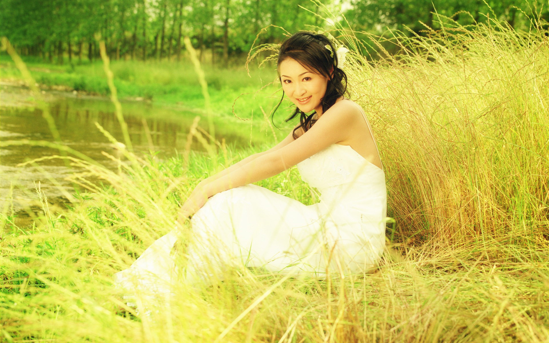 Похожие обои на В белом платье на желтой траве у озера: