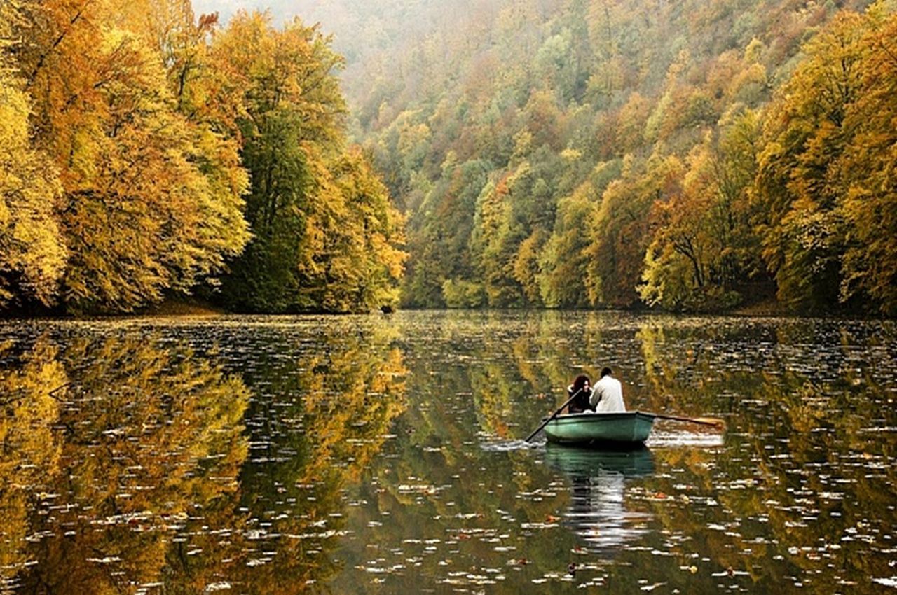 Скачать обои для рабочего стола В лодке по осенней реке и фото