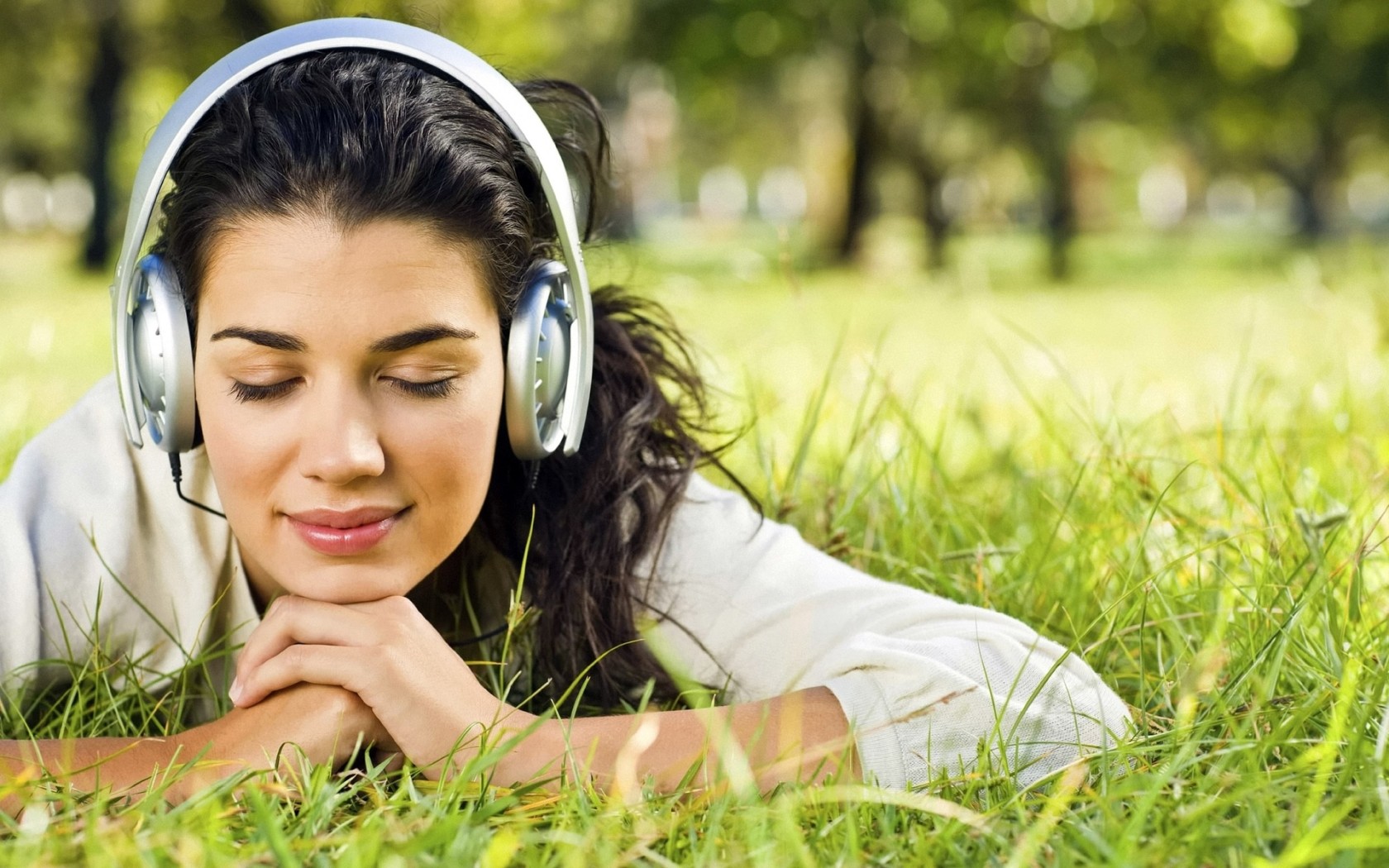 Скачать обои для рабочего стола В наушниках на травке и фото