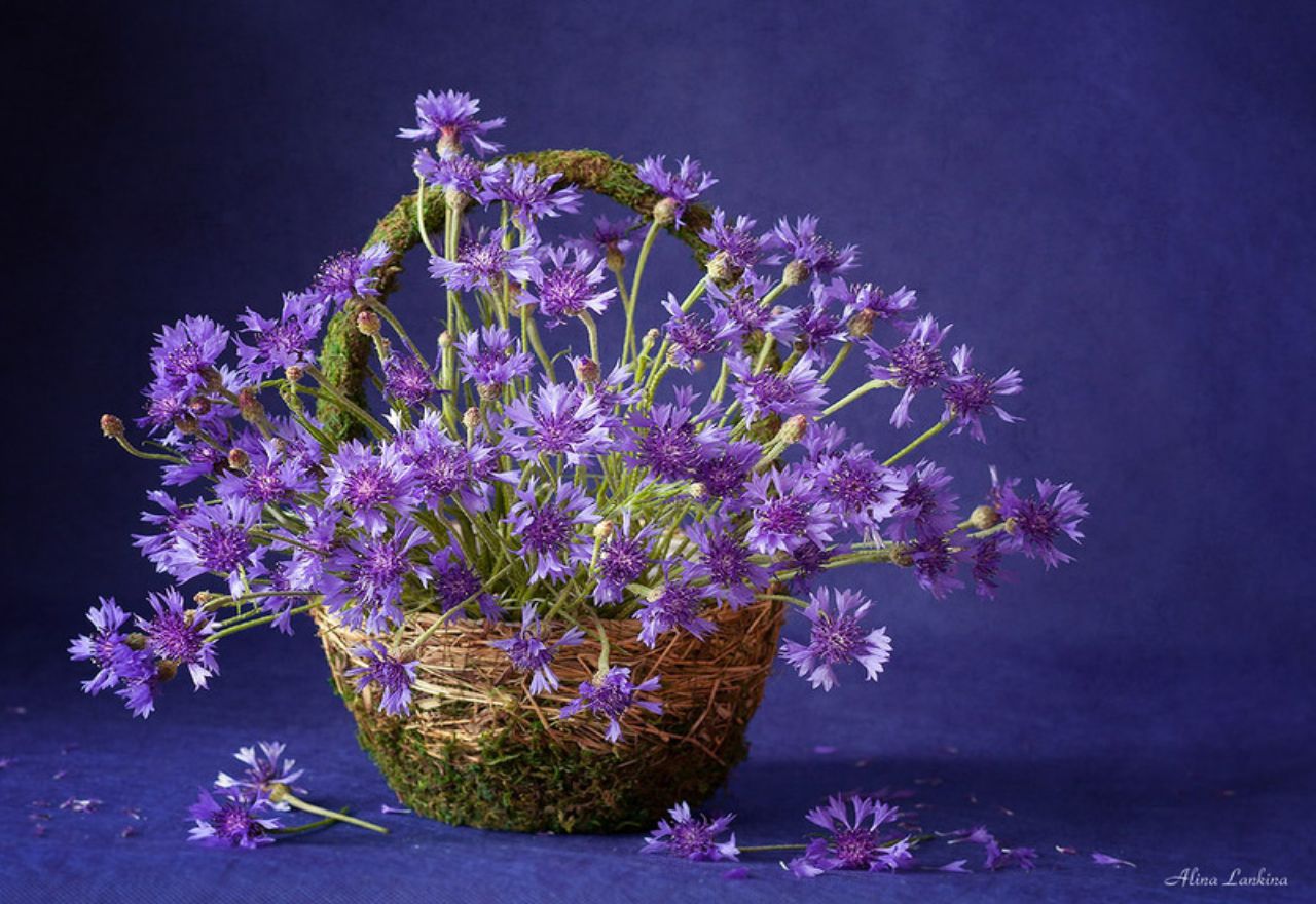 Скачать обои для рабочего стола Васильки в корзине и фото