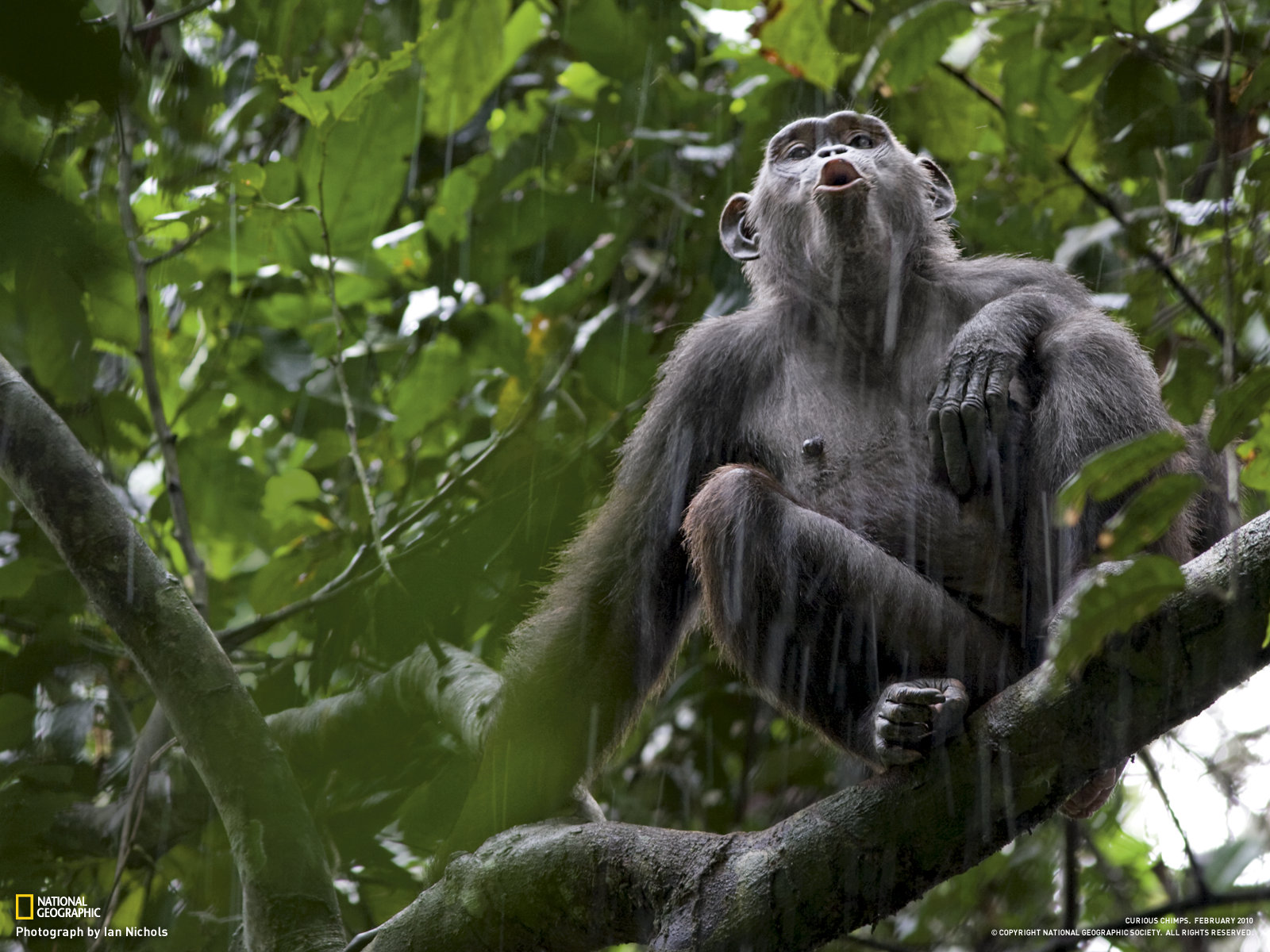 Скачать обои для рабочего стола Веселый примат на ветке под дождем и фото