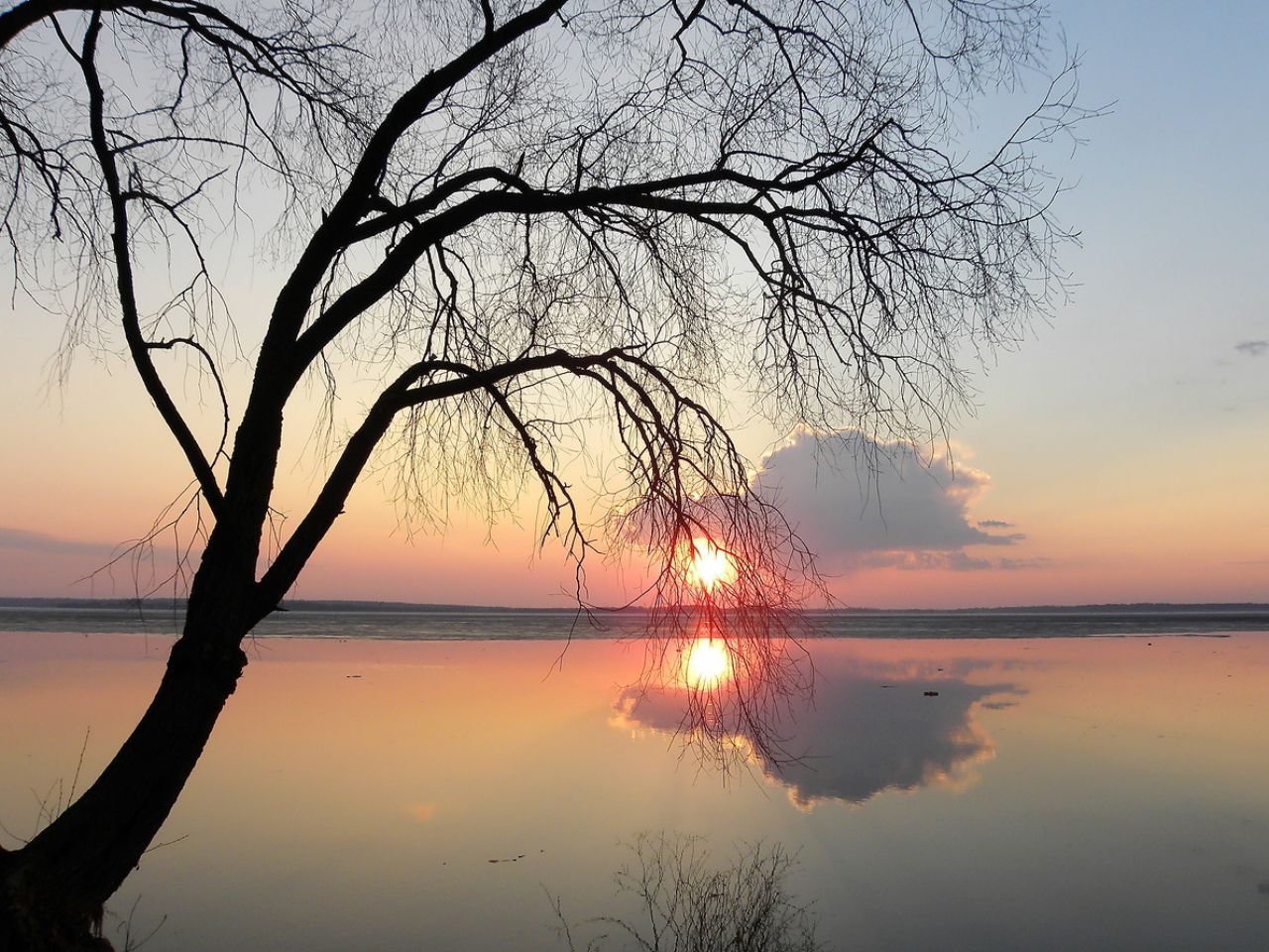 Скачать обои для рабочего стола Весеннее дерево, у зеркальной глади воды на закате и фото