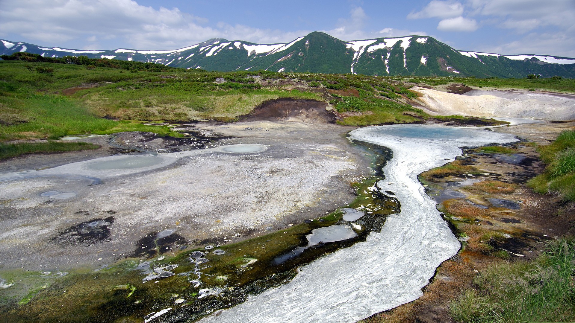 Скачать обои для рабочего стола Весенний ручей в горах, среди зеленеющих холмов и фото