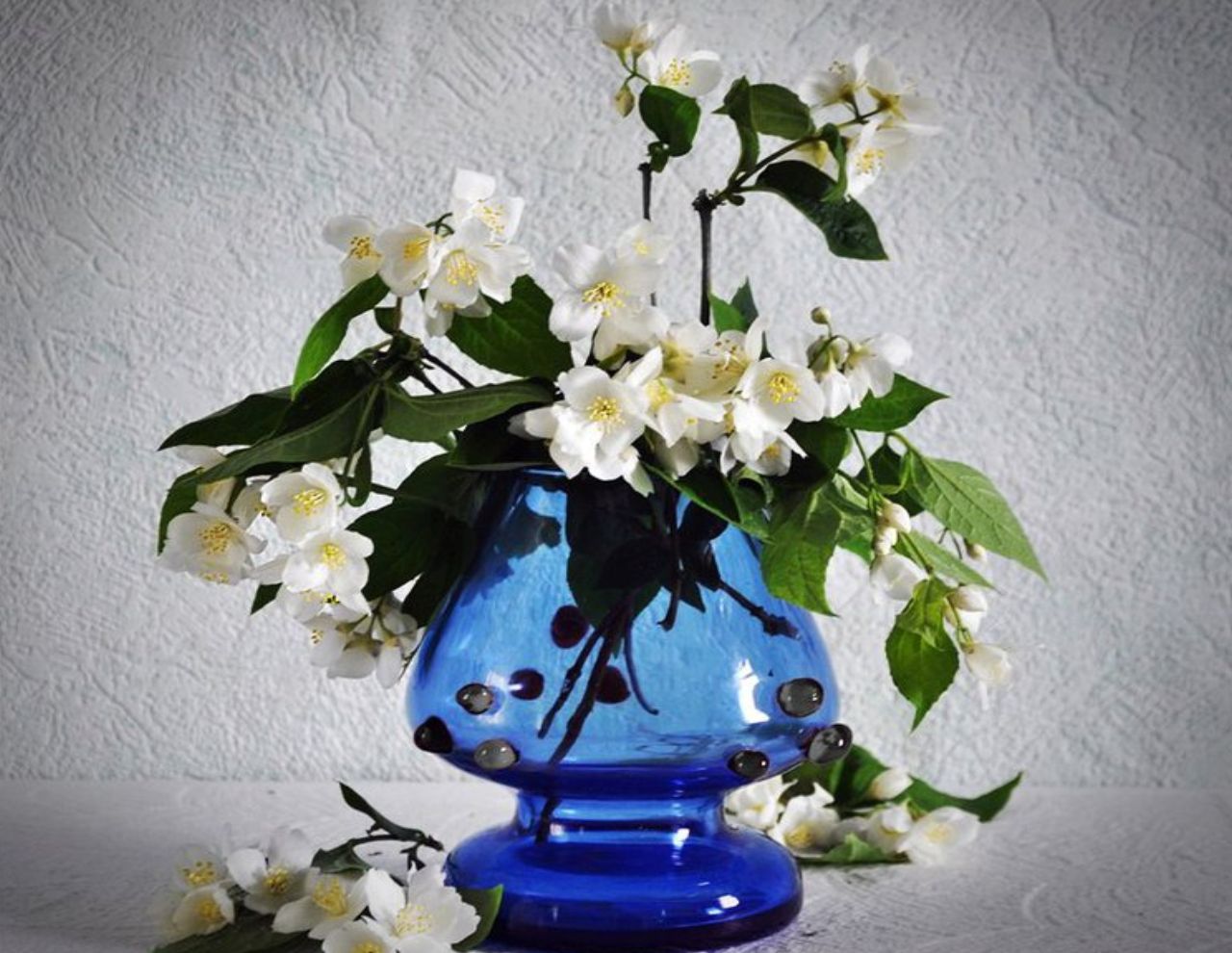 Похожие обои на Ветки жасмина в синей вазе: