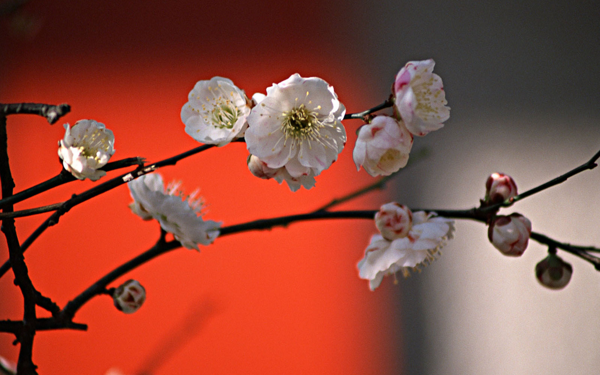 Похожие обои на Веточка цветущая на красно-сером фоне: