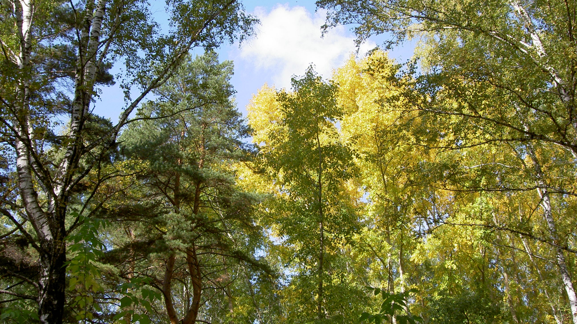 Скачать обои для рабочего стола Вид на сосны и березы летом и фото