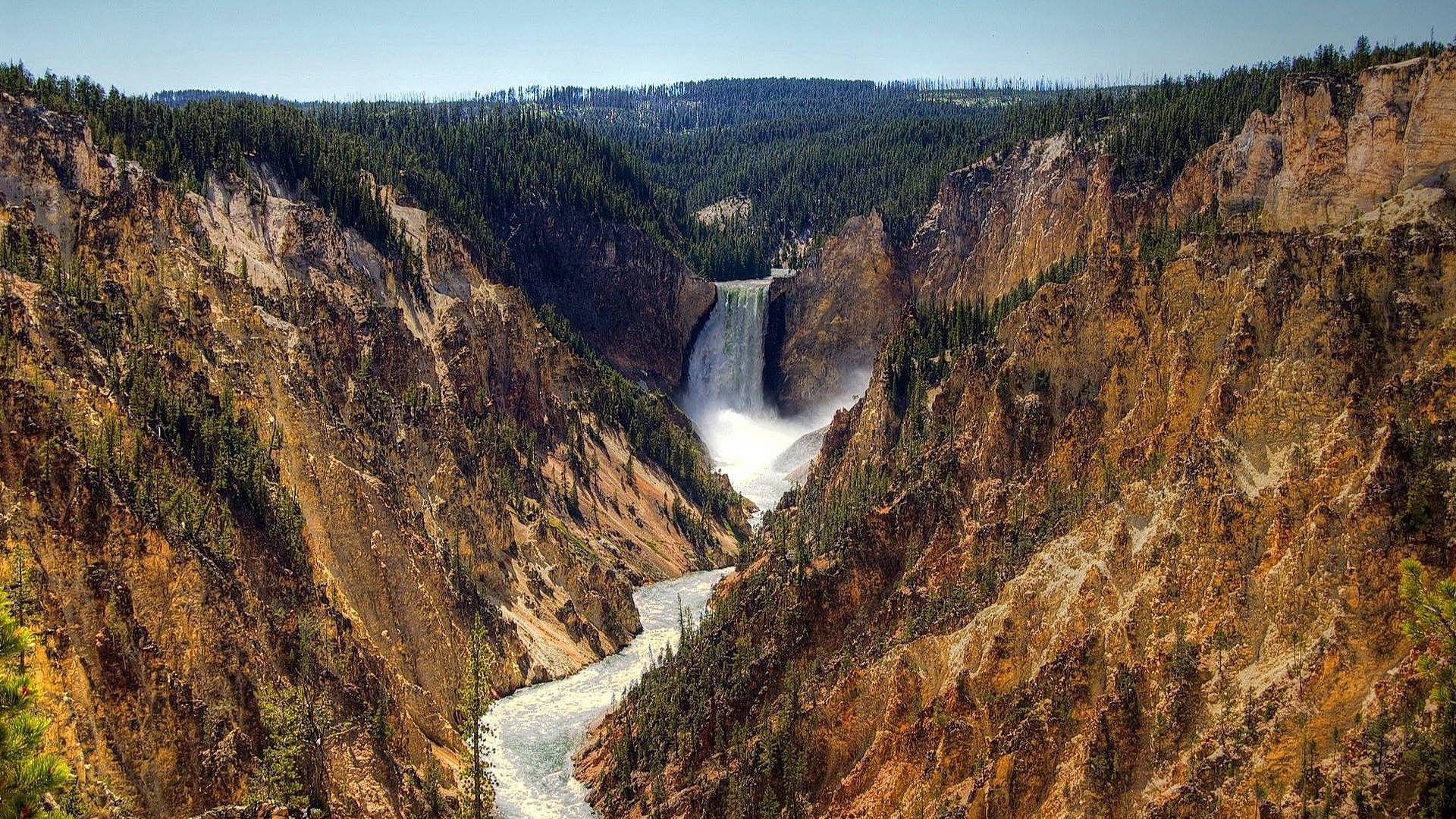 Скачать обои для рабочего стола Вид с высока на реку бегущую среди гор и фото