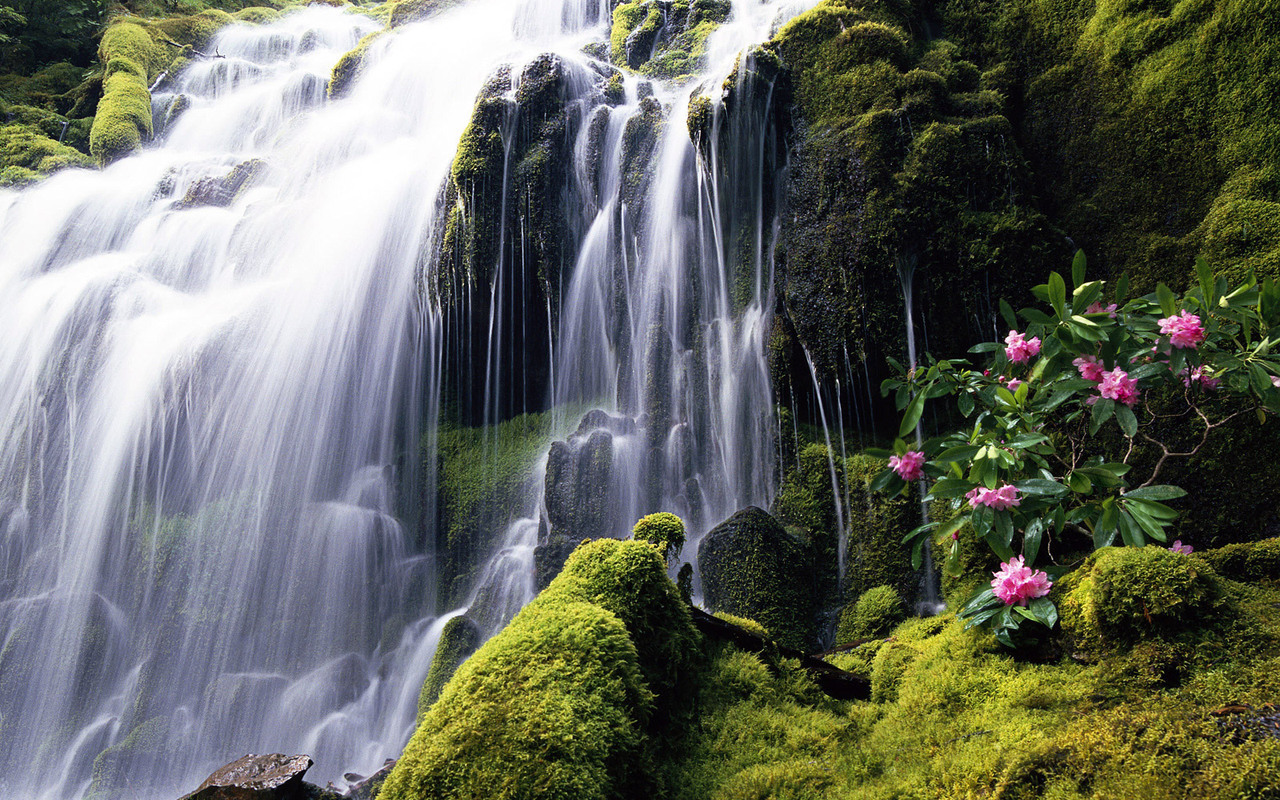 Скачать обои для рабочего стола Водопад и цветочки растут и фото