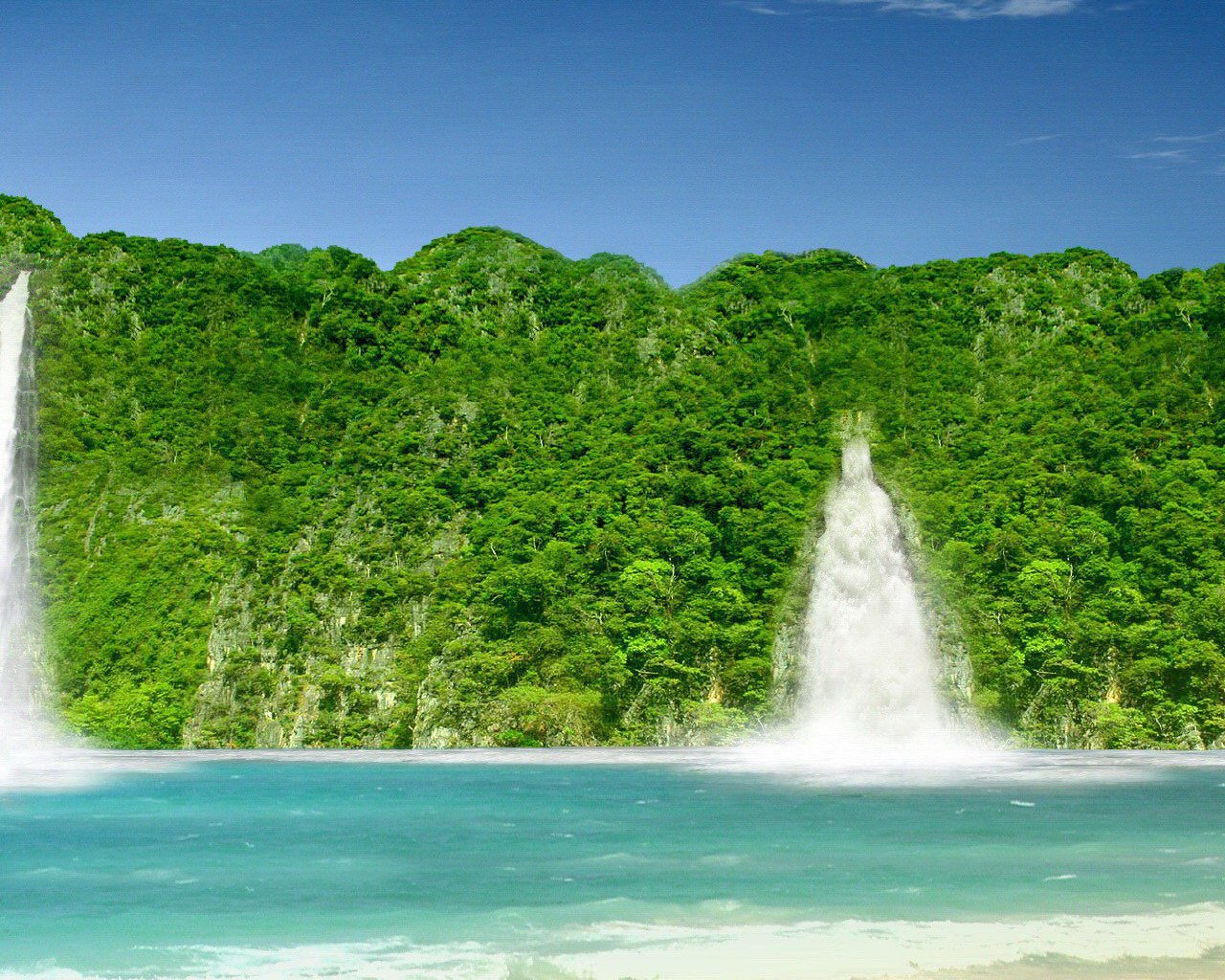 Скачать обои для рабочего стола Водопад и зелень холмов и фото