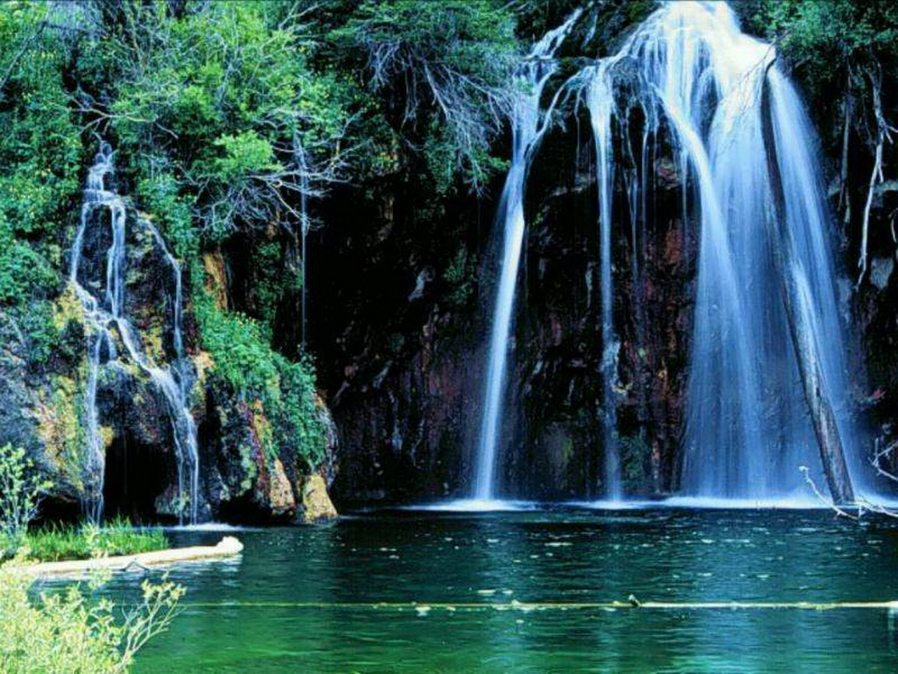 Скачать обои для рабочего стола Водопад из густой чащи леса впадает в реку и фото