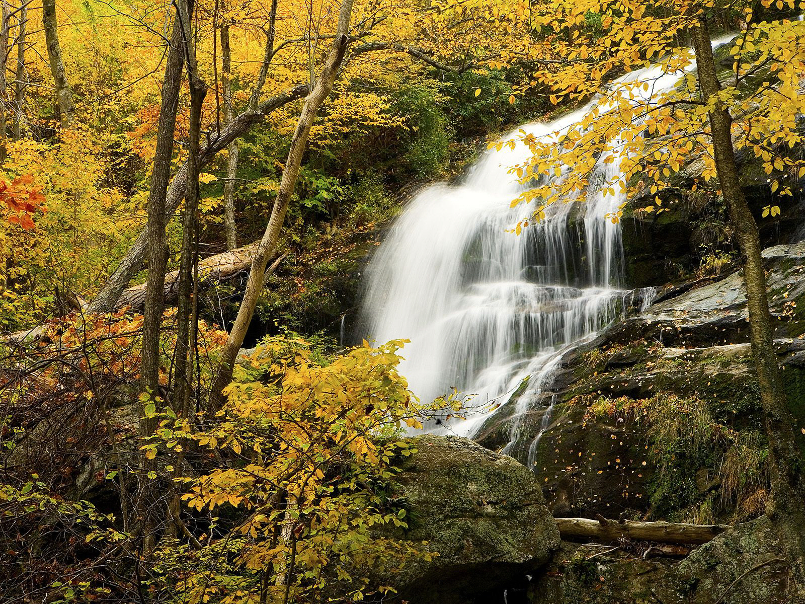 Скачать обои для рабочего стола Водопад в лесу среди золотых ветвей и фото