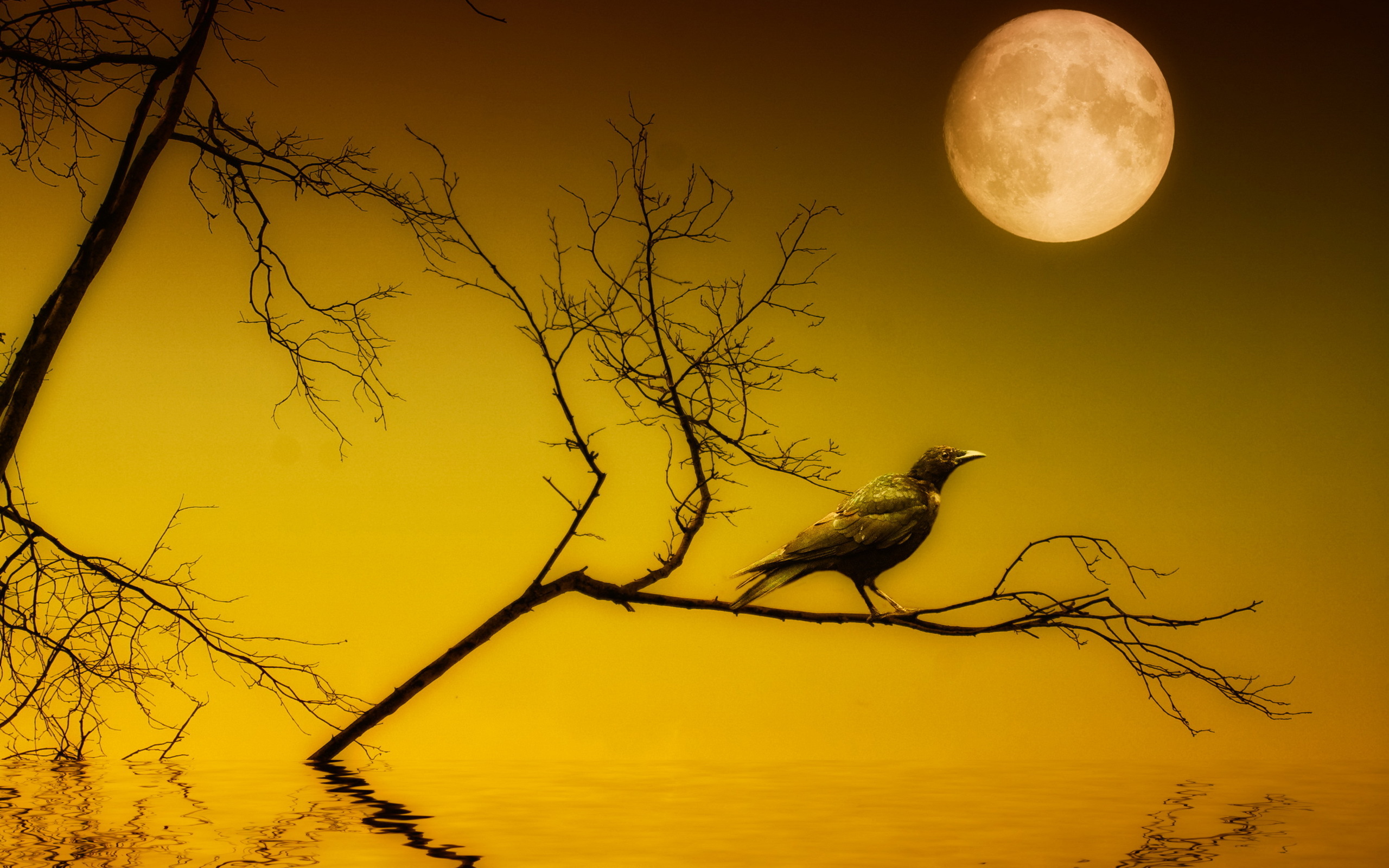 Скачать обои для рабочего стола Ворон на ветке торчащей из воды и фото