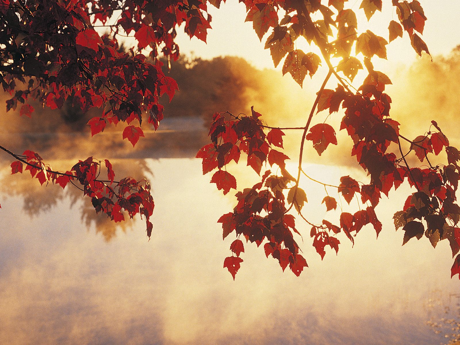 Скачать обои для рабочего стола Восход сквозь осенние листья и фото