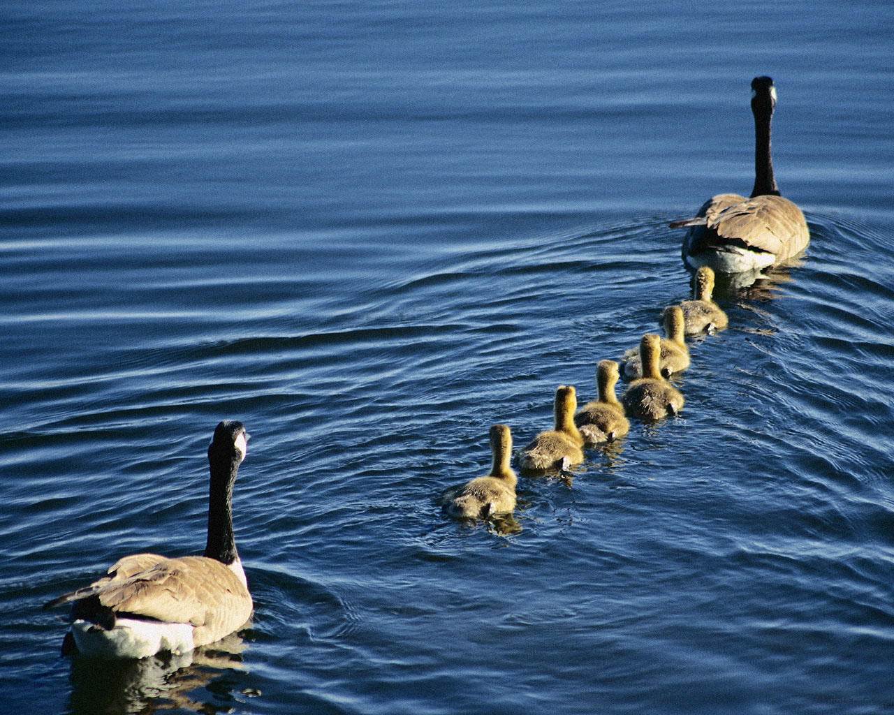Скачать обои для рабочего стола Выводок уток на прогулке с замыкающим папой-селезнем и фото
