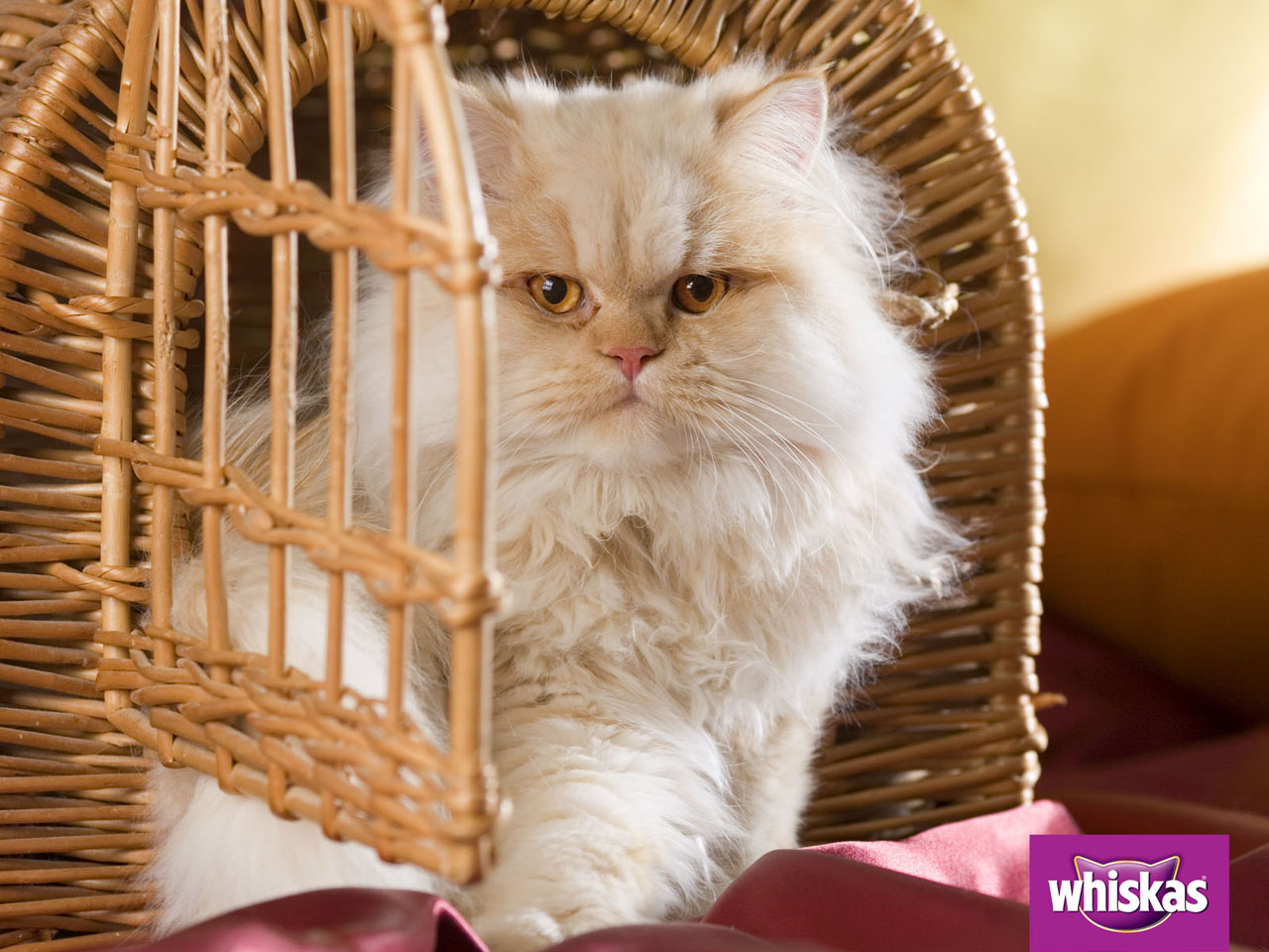 Скачать обои для рабочего стола Whiskas. кошка смотрит из домика и фото
