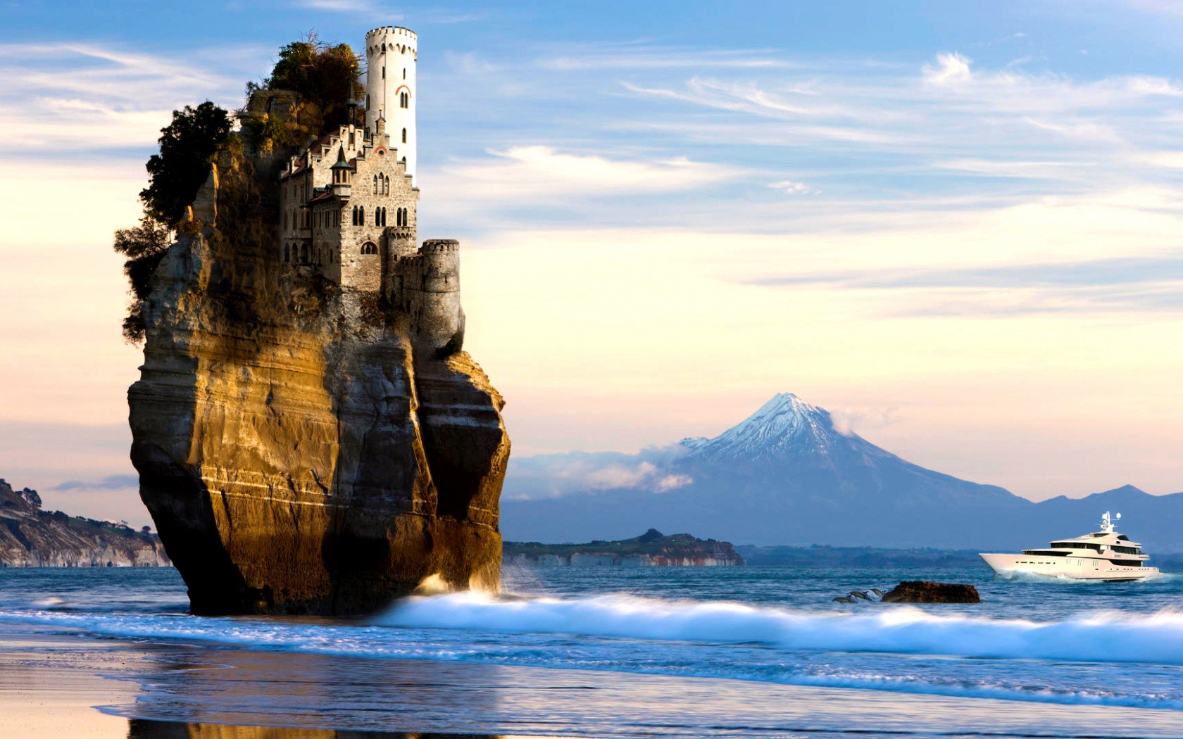 Скачать обои для рабочего стола Яхта у замка на скале и фото