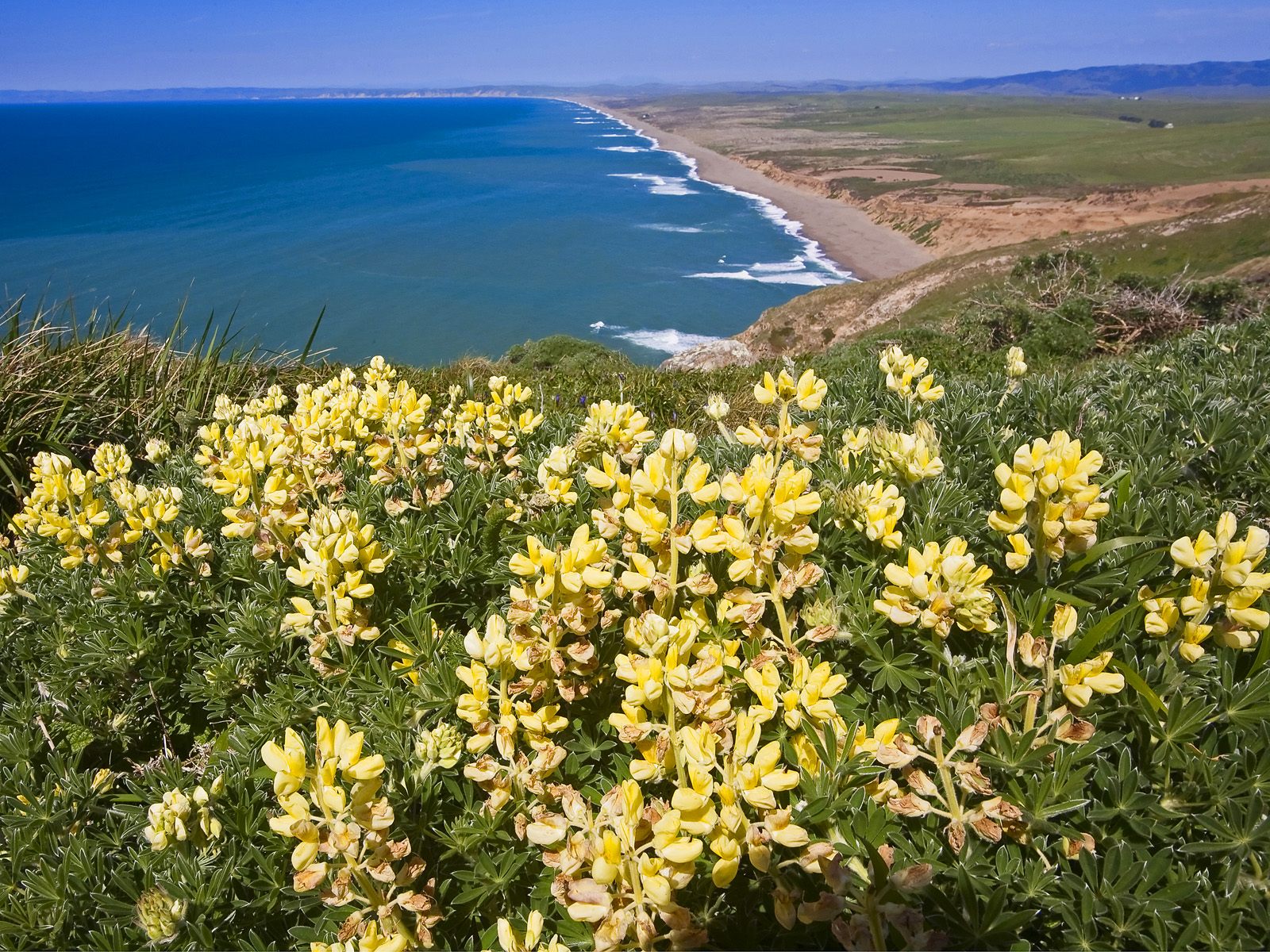Обои Ярко-жёлтые цветы над морским побережьем