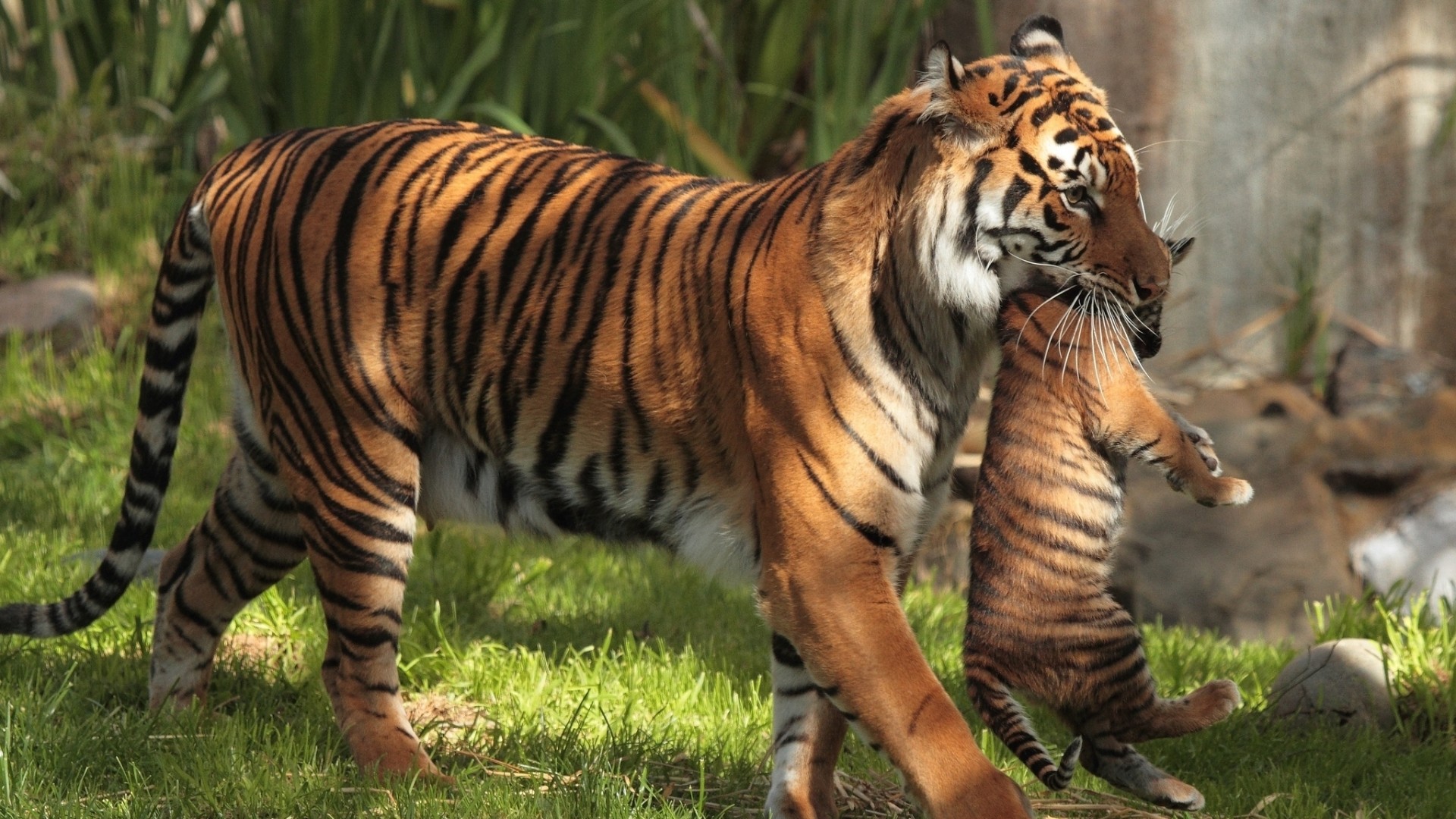 Скачать обои для рабочего стола Заботливая тигрица с детенышем и фото