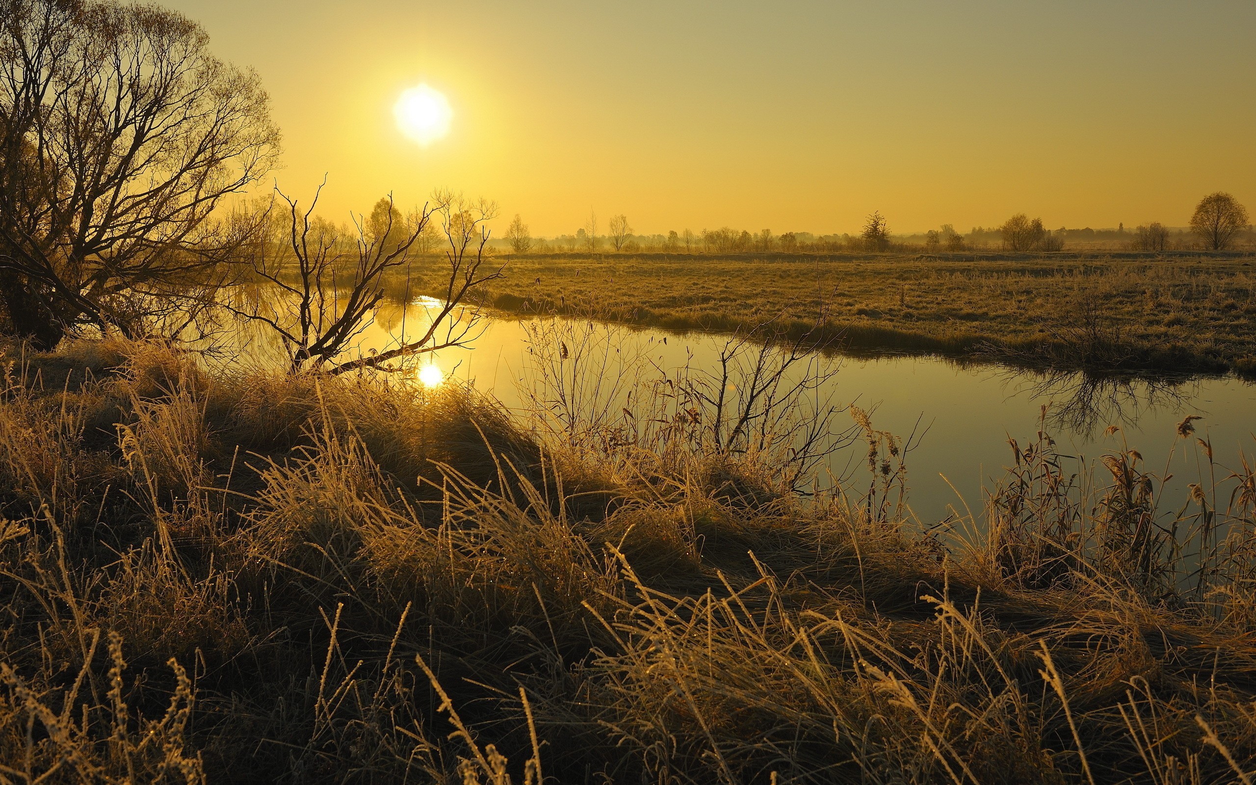 Скачать обои для рабочего стола Закат у реки с посохшей тpавой и фото