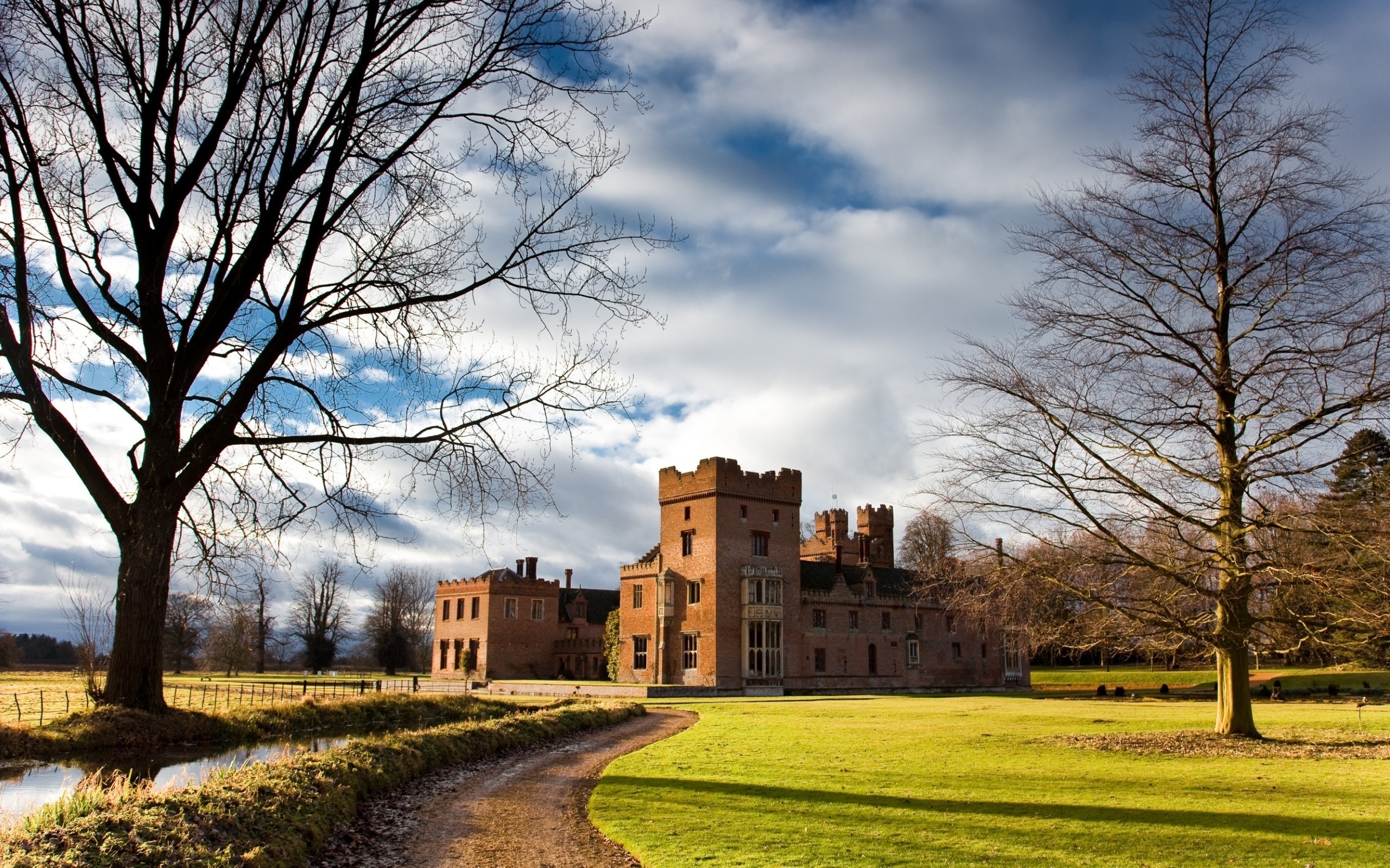 Скачать обои для рабочего стола Замок перед речкой с мостом и фото