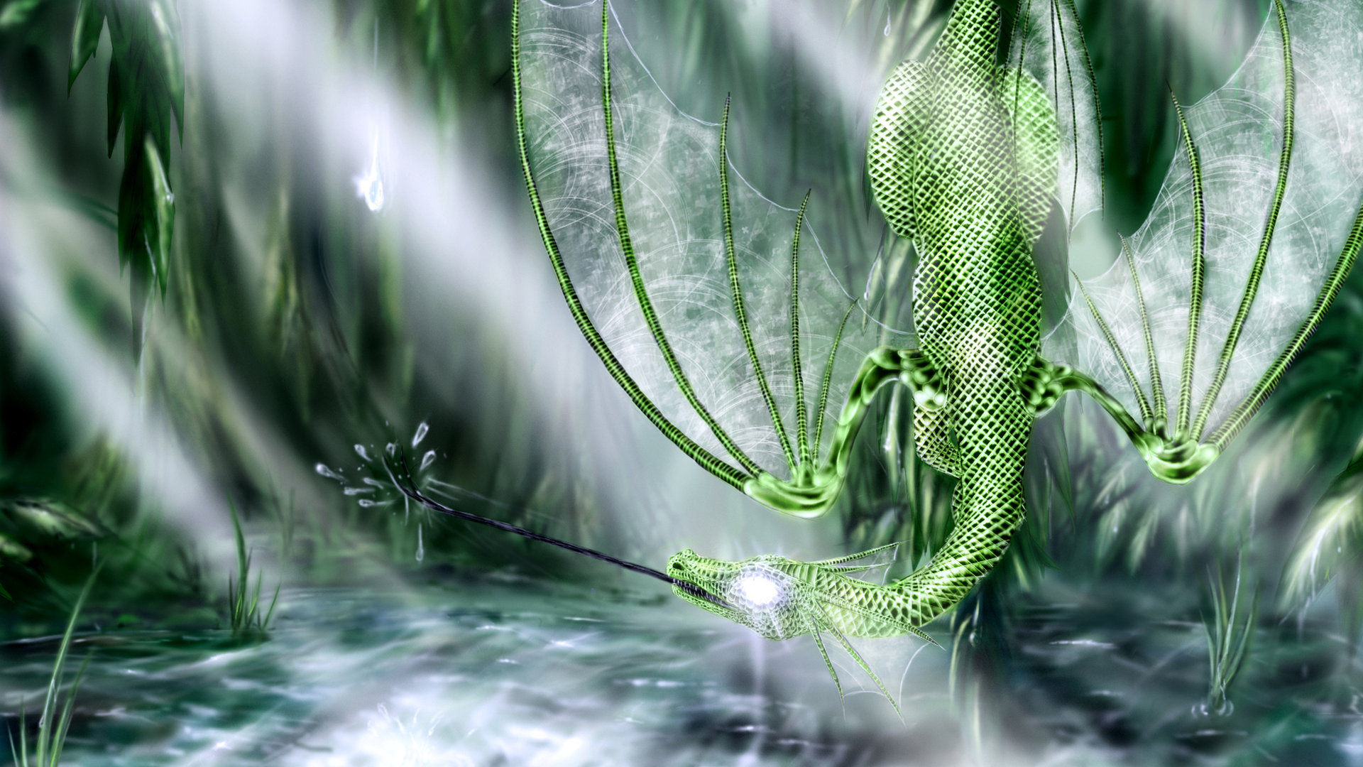 Скачать обои для рабочего стола Зеленый дракон ловящий каплю и фото