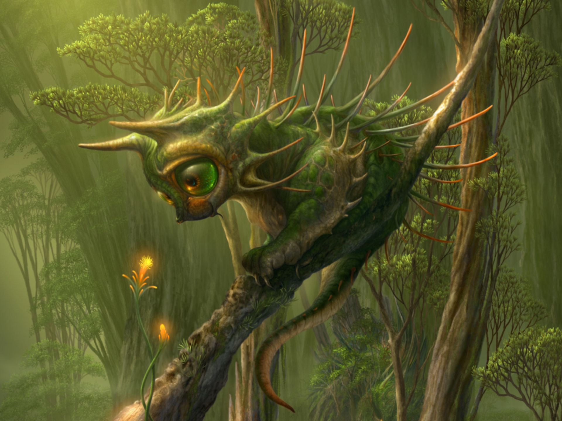 Скачать обои для рабочего стола Зеленый дракончик на дереве и фото