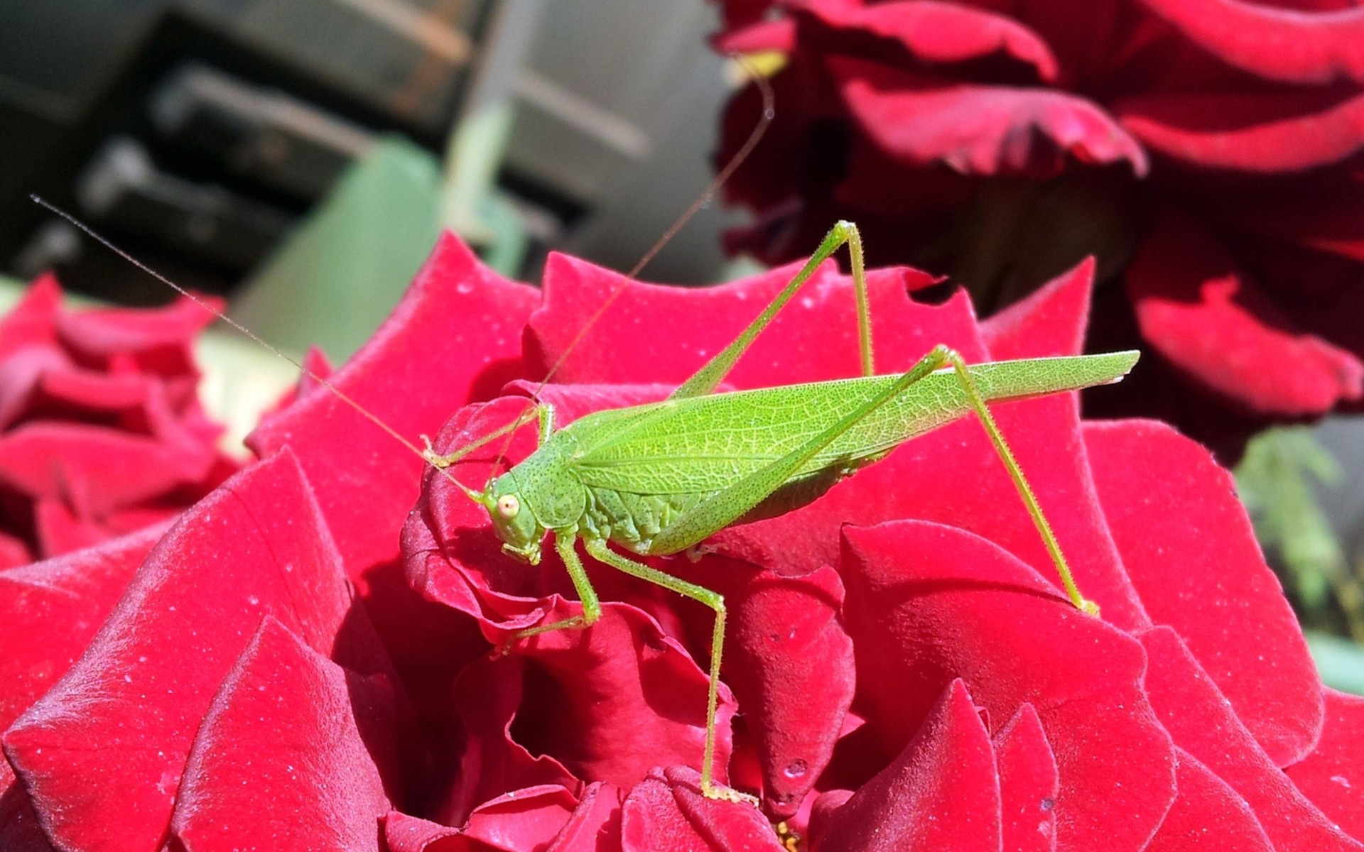 Скачать обои для рабочего стола зеленый кузнечик на розe и фото