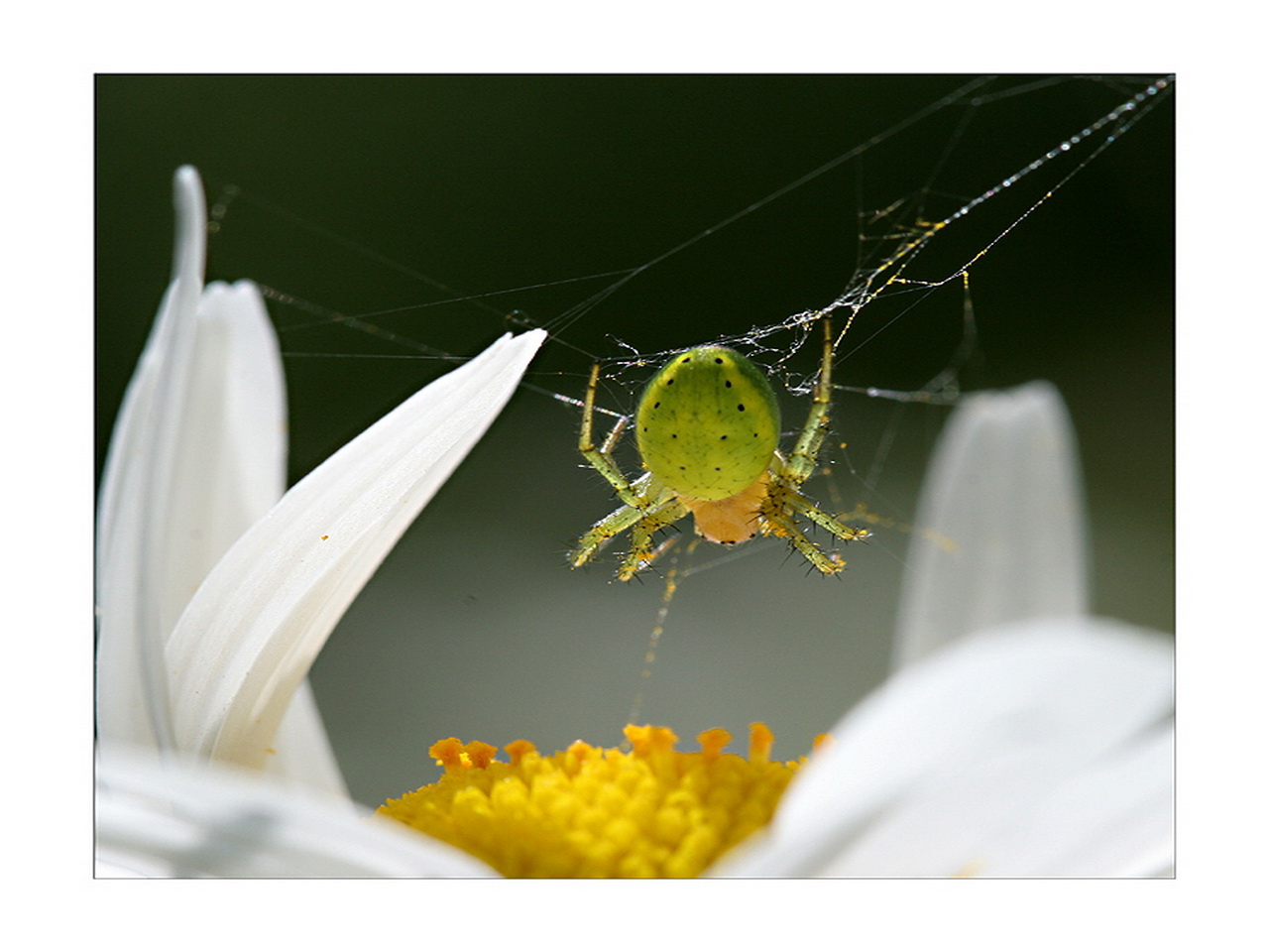 Скачать обои для рабочего стола Зеленый паучок на цветке ромашки и фото