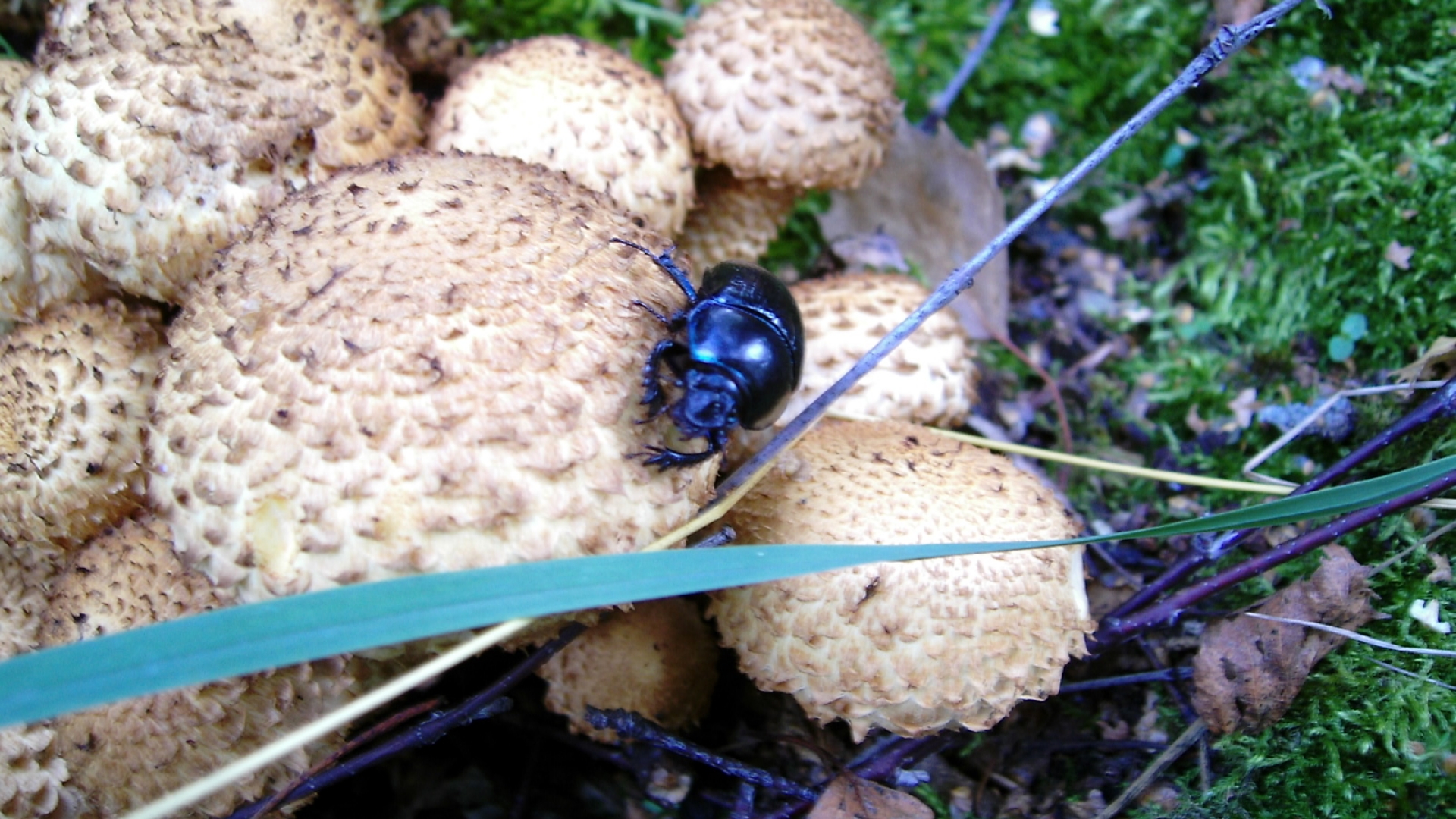 Скачать обои для рабочего стола Жук лазит по грибам и фото