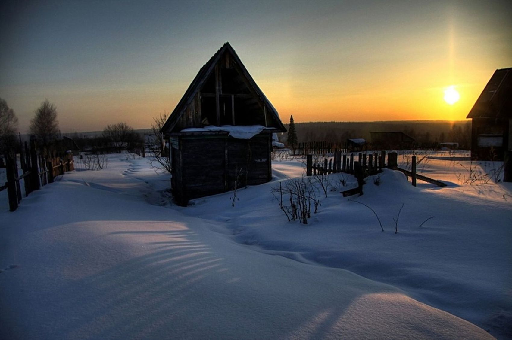 Скачать обои для рабочего стола Зима в деревне - на закате и фото