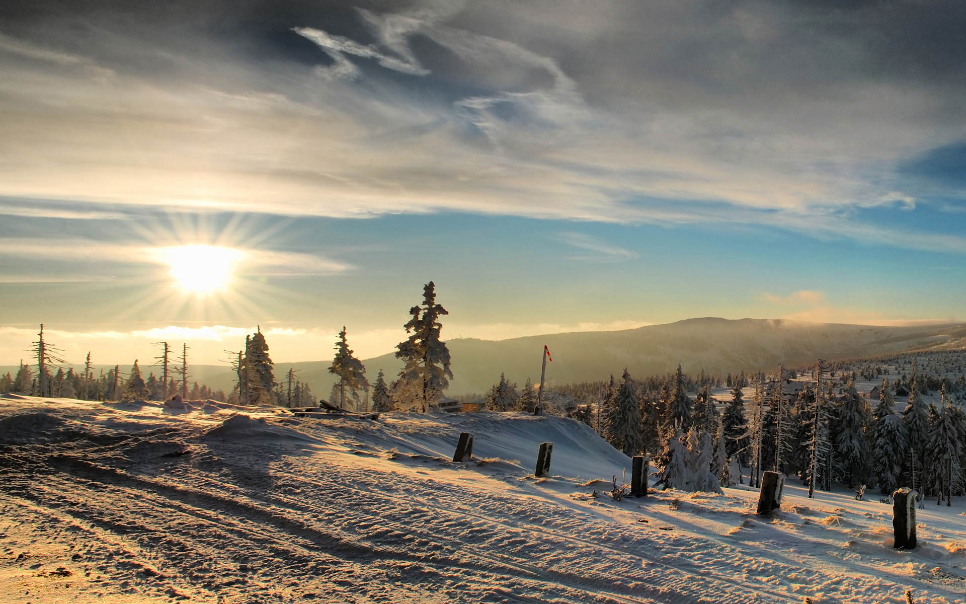 Скачать обои для рабочего стола Зимнее солнце над лесом и фото